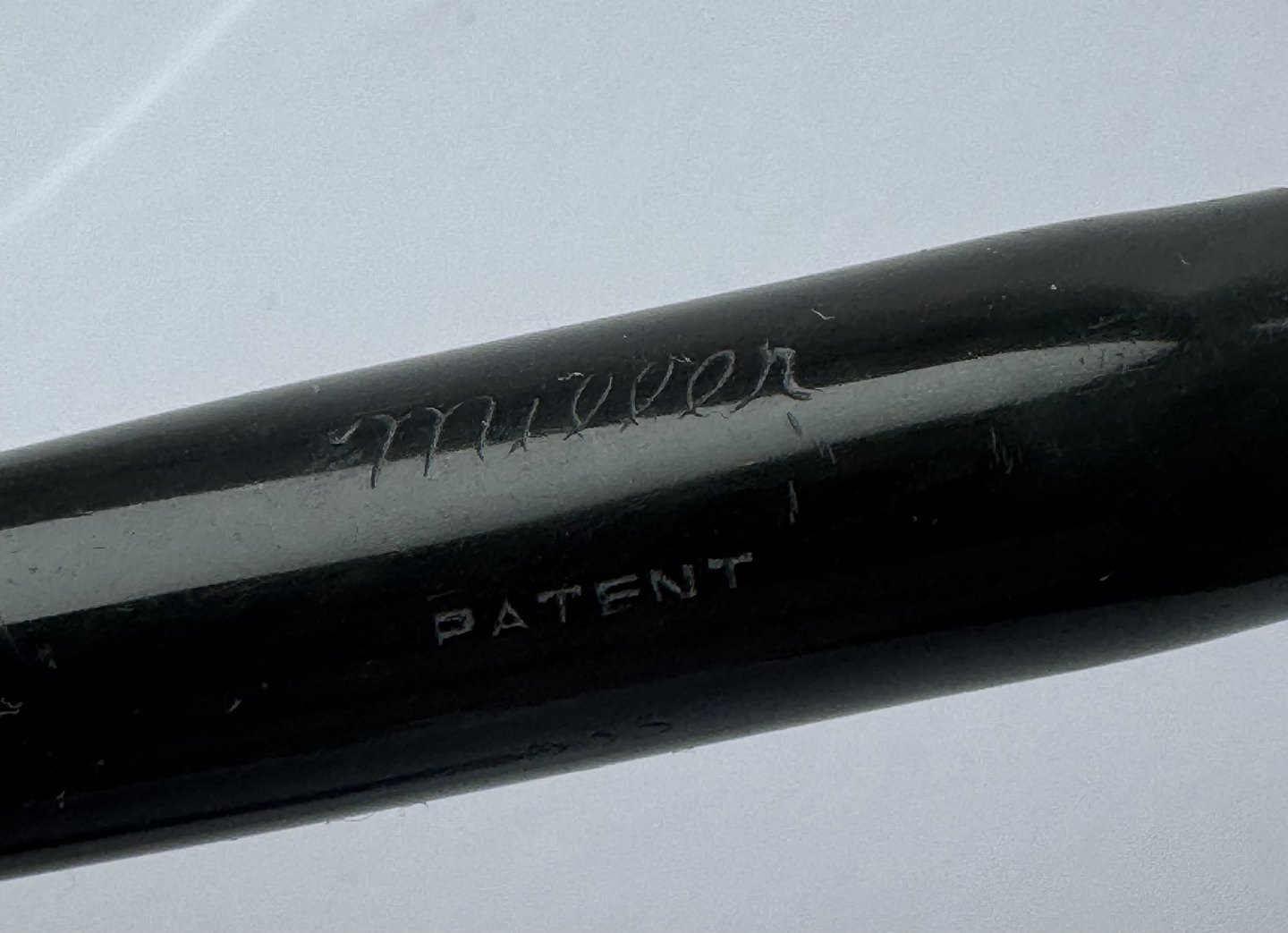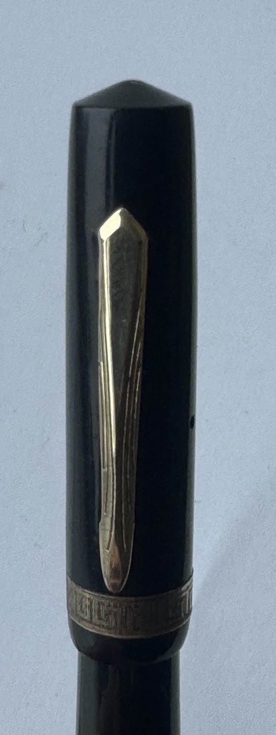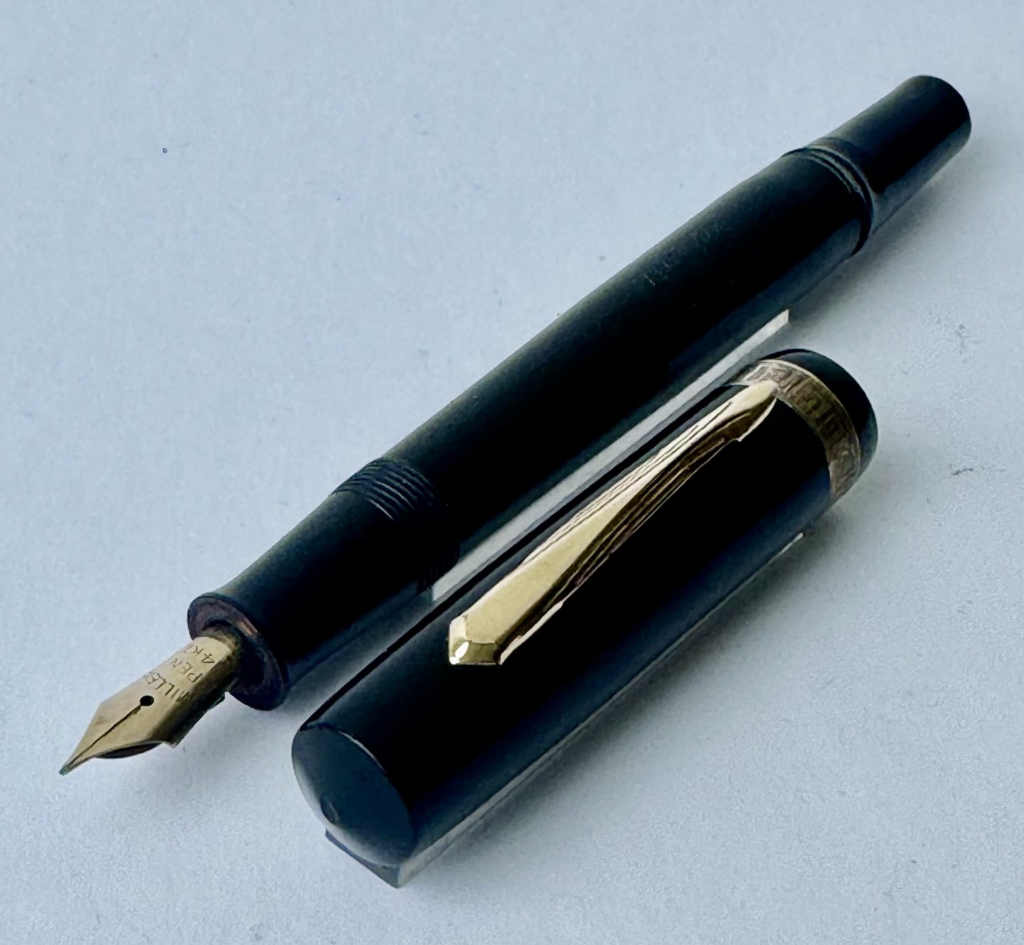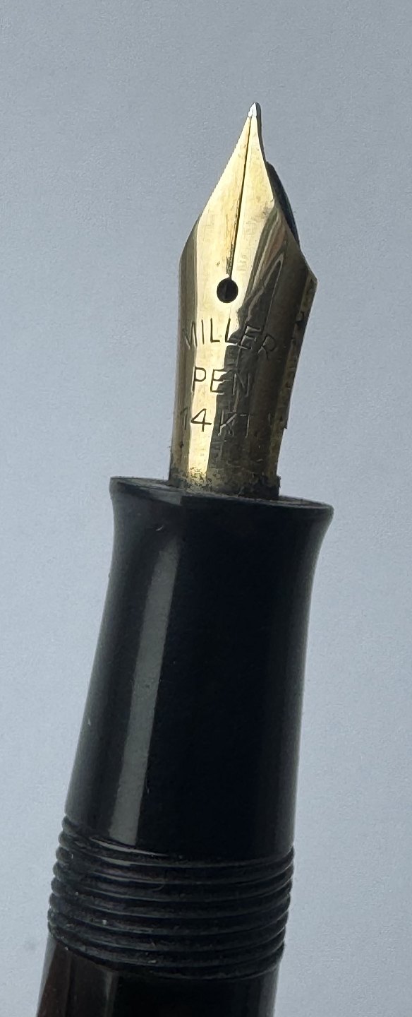 Sort Miller nr. 635 fyldepen. Push button filler.Der skal indsættes en ny gummisæk før end pennen igen kan optage blæk og skrive. Bortset fra et lille skår på hætten (se foto) er pennen i god stand. Alle dele originale til denne model. Længde 12,6 cm