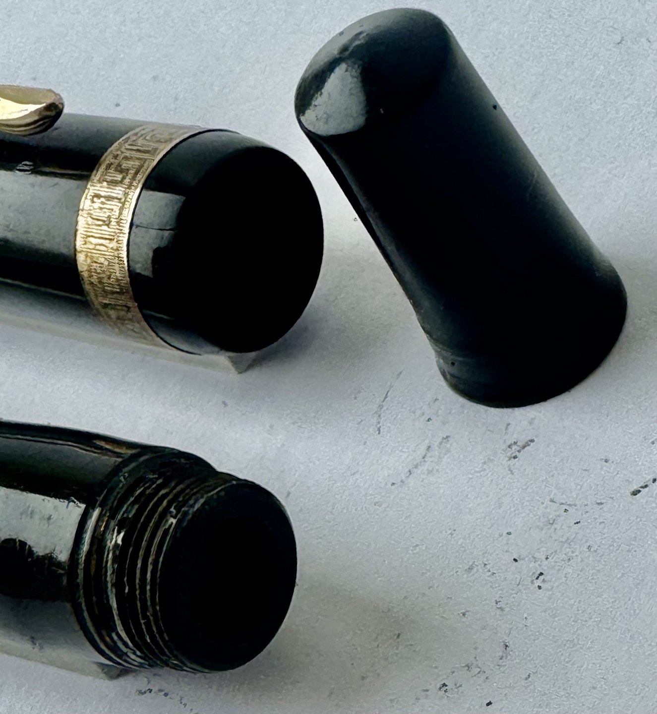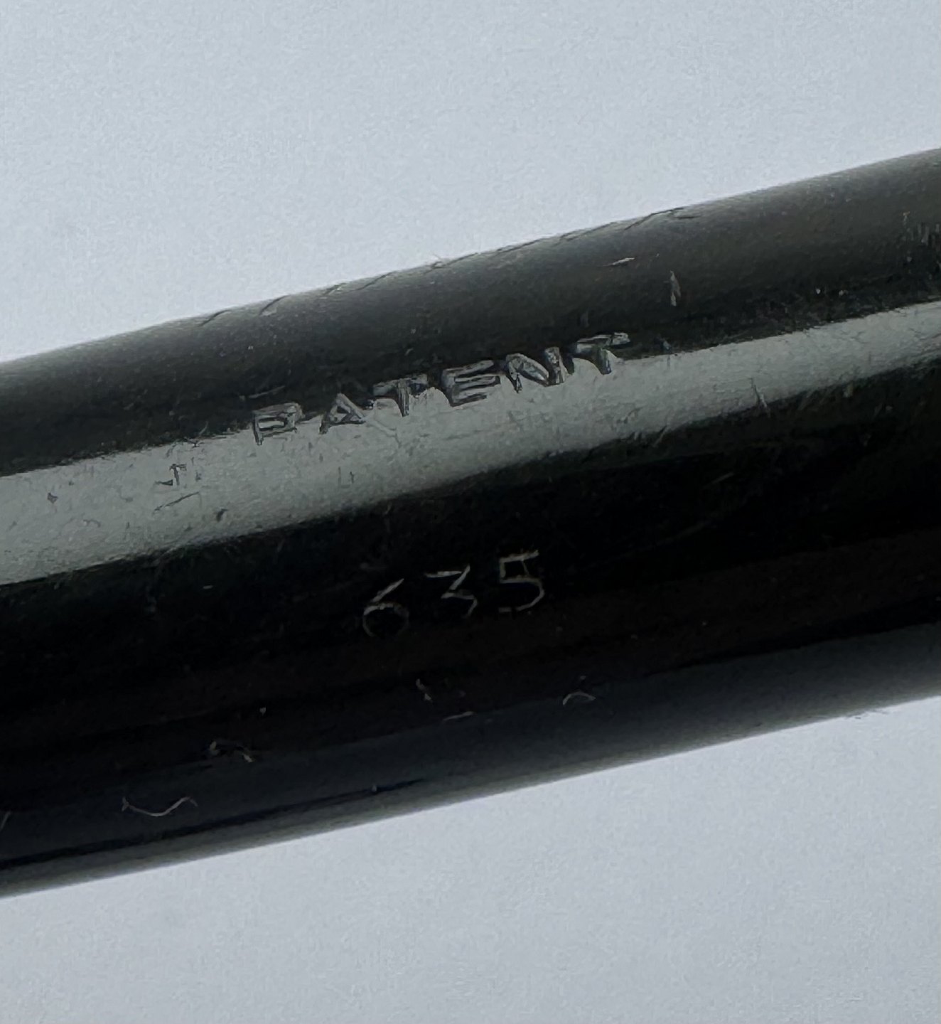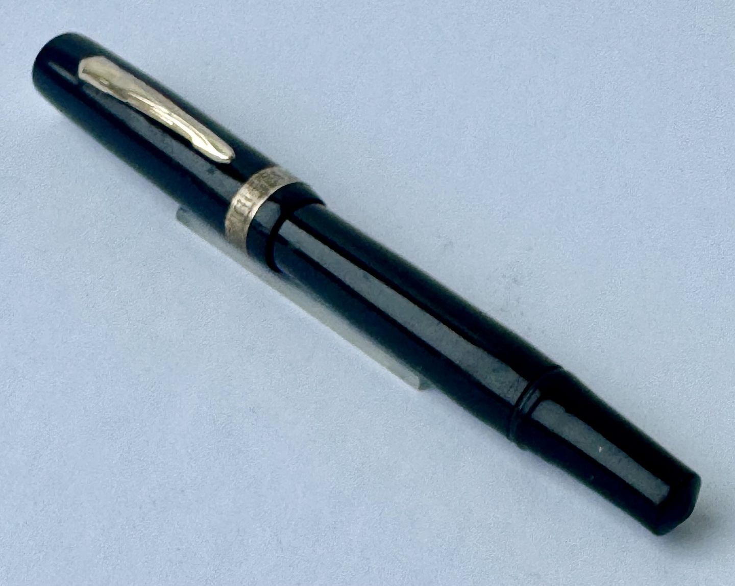 Sort Miller nr. 635 fyldepen. Push button filler.Der skal indsættes en ny gummisæk før end pennen igen kan optage blæk og skrive. Bortset fra et lille skår på hætten (se foto) er pennen i god stand. Alle dele originale til denne model. Længde 12,6 cm