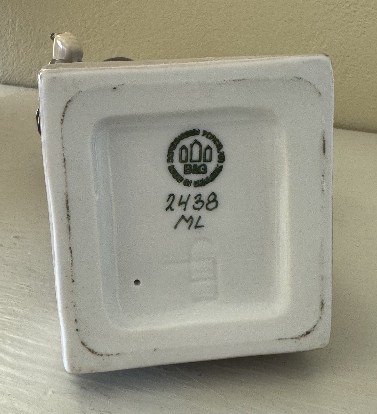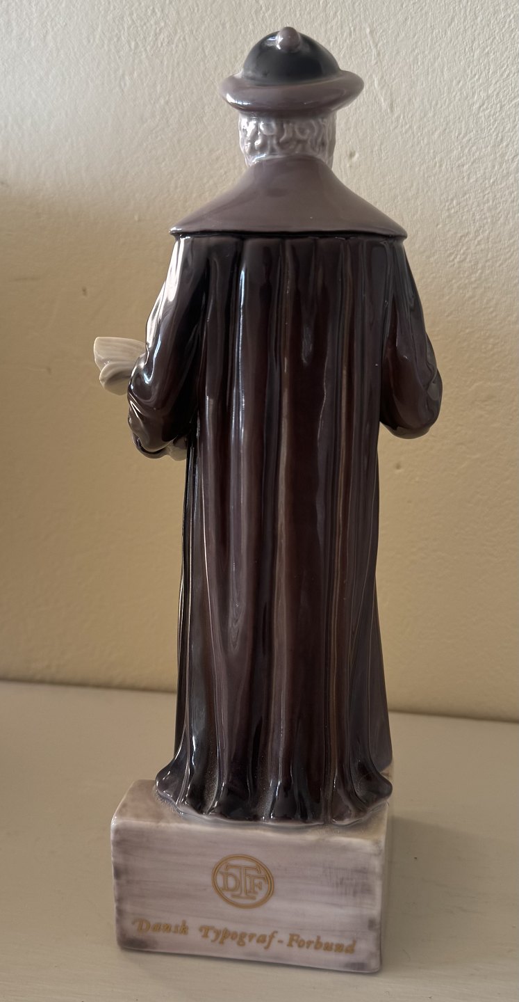 Figur i porcelæn fra Bing og Grøndahl. Forestillende Johann Gutenberg (1397-1468), der opfandt bogtrykkerkunsten, eller forenklet sagt, maskinen der kunne masseproducere tryksager og bøger. Derfor denne figur, der er fremstillet i et mindre oplag på 50 stk. til Dansk Typograf-Forbund. Figuren er brugt som hædersgave fra forbundet. Denne figur er 24 cm høj og fremstår i perfekt stand. 1. sortering. Ingen skader eller reparationer. Fabriksstemplet på bunden samt indridset ubekendt kunstner signatur EJ. Modelnummer 2438.