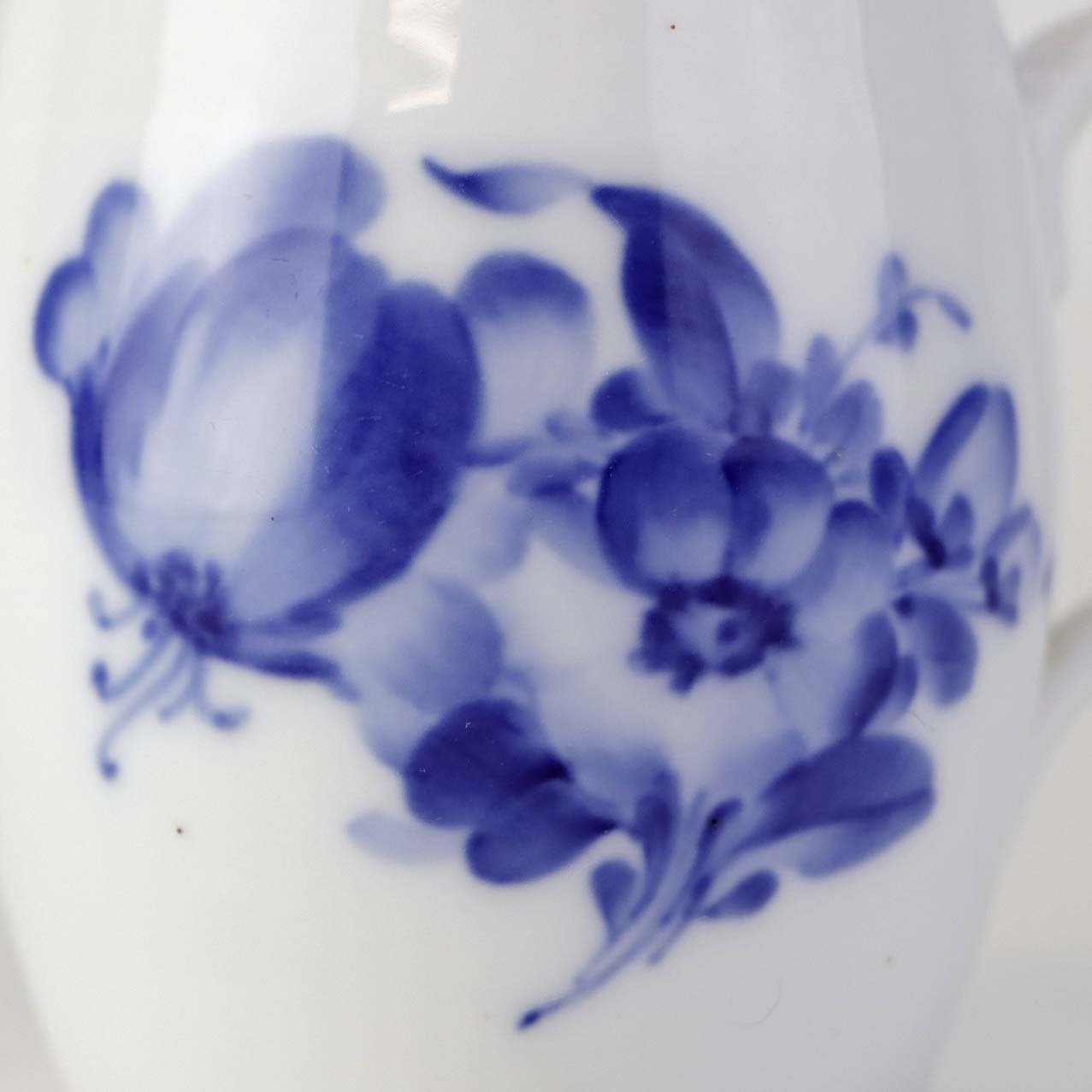 Service i glat hvidt porcelæn med flettet kant og dekoration af blå blomster.