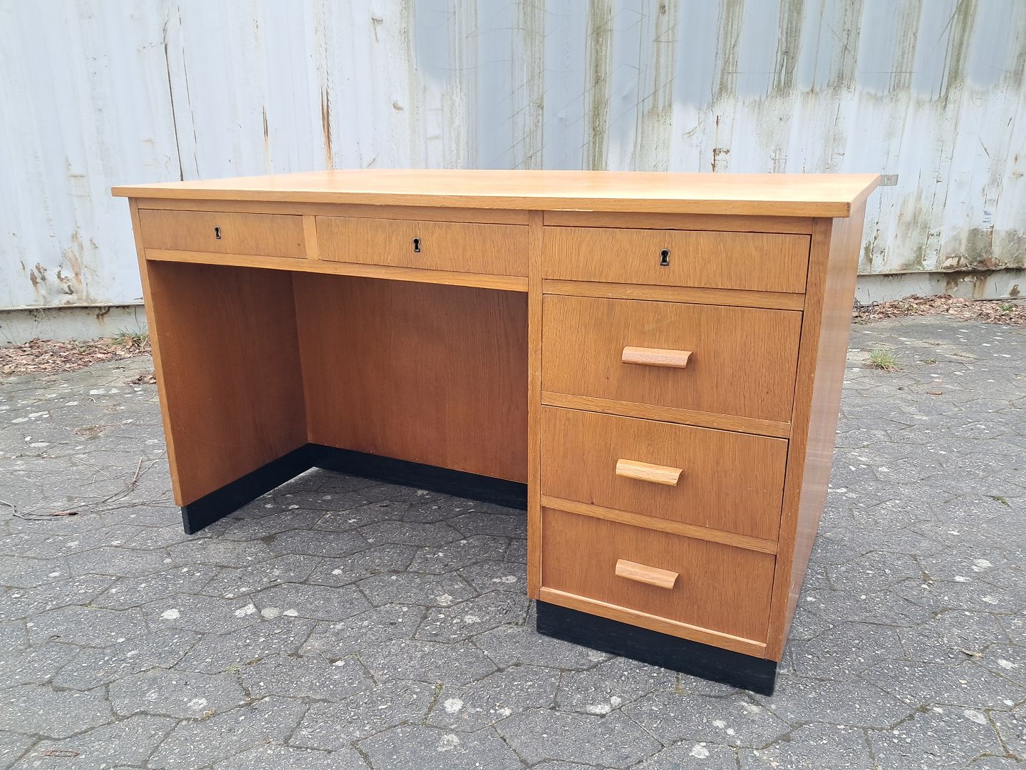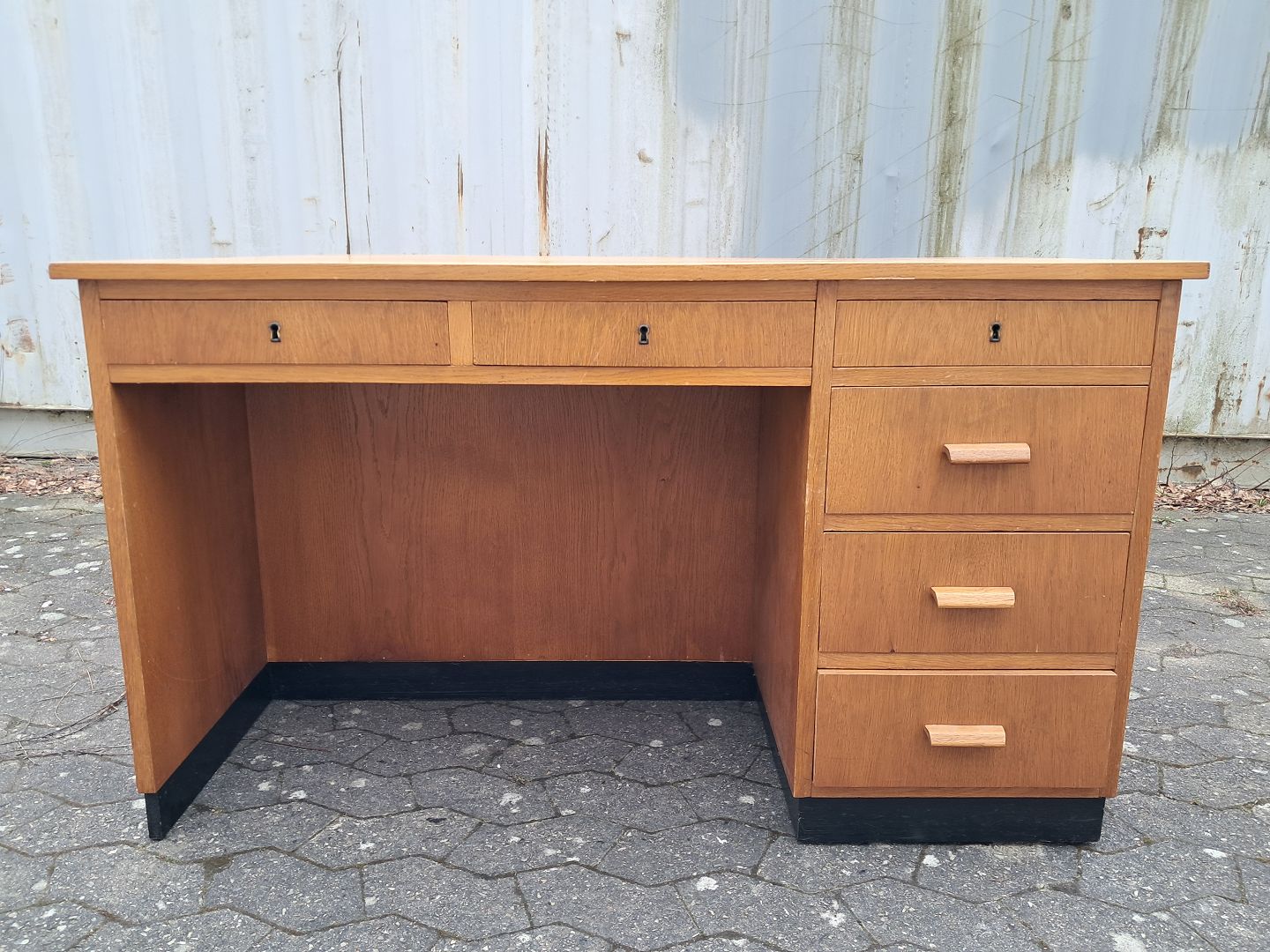 Skrivebord i fineret egetræ, fra 1950erne.Det har brugsspor.