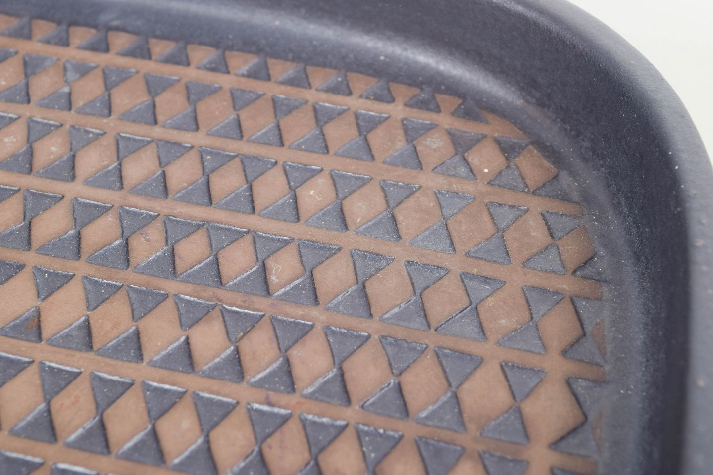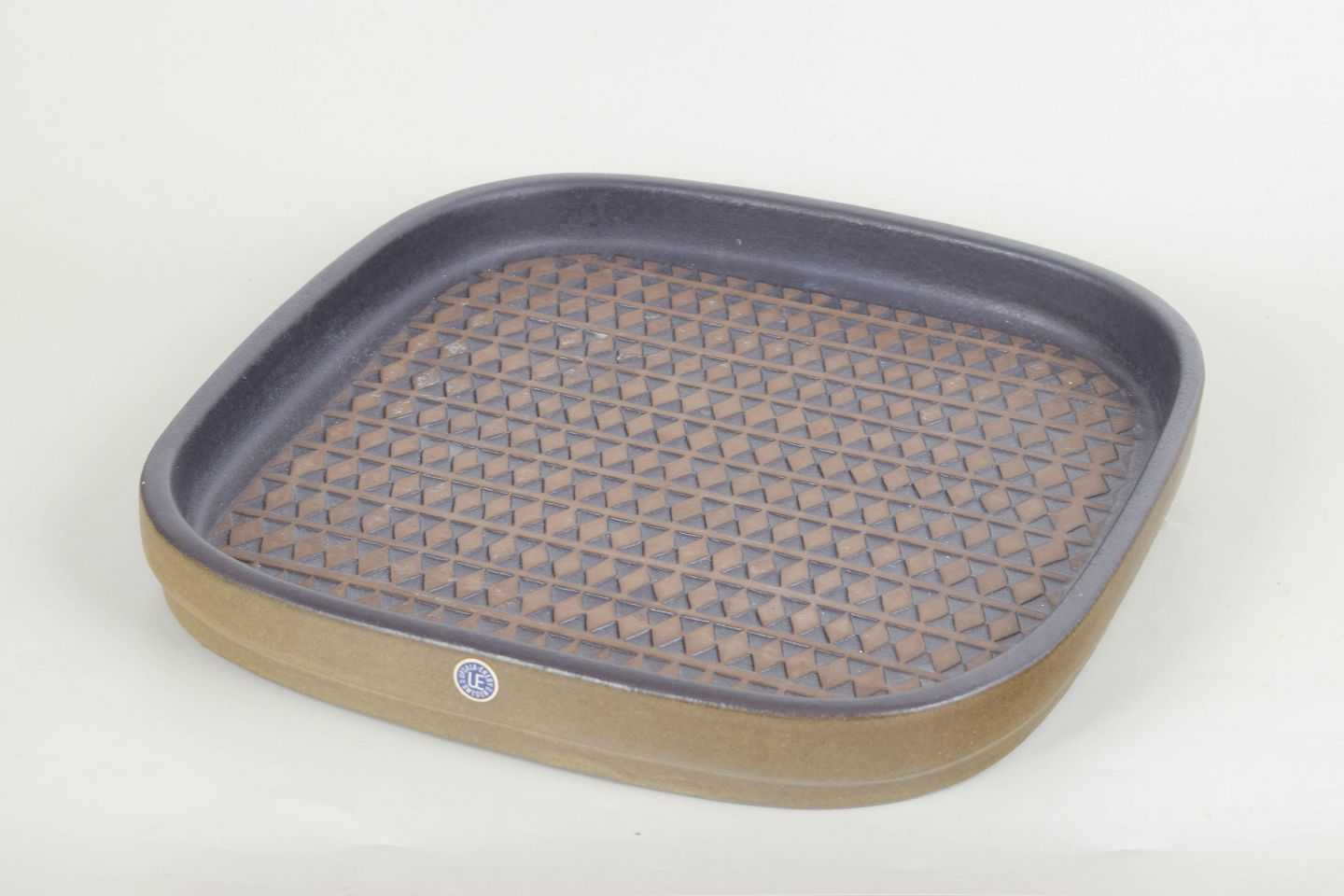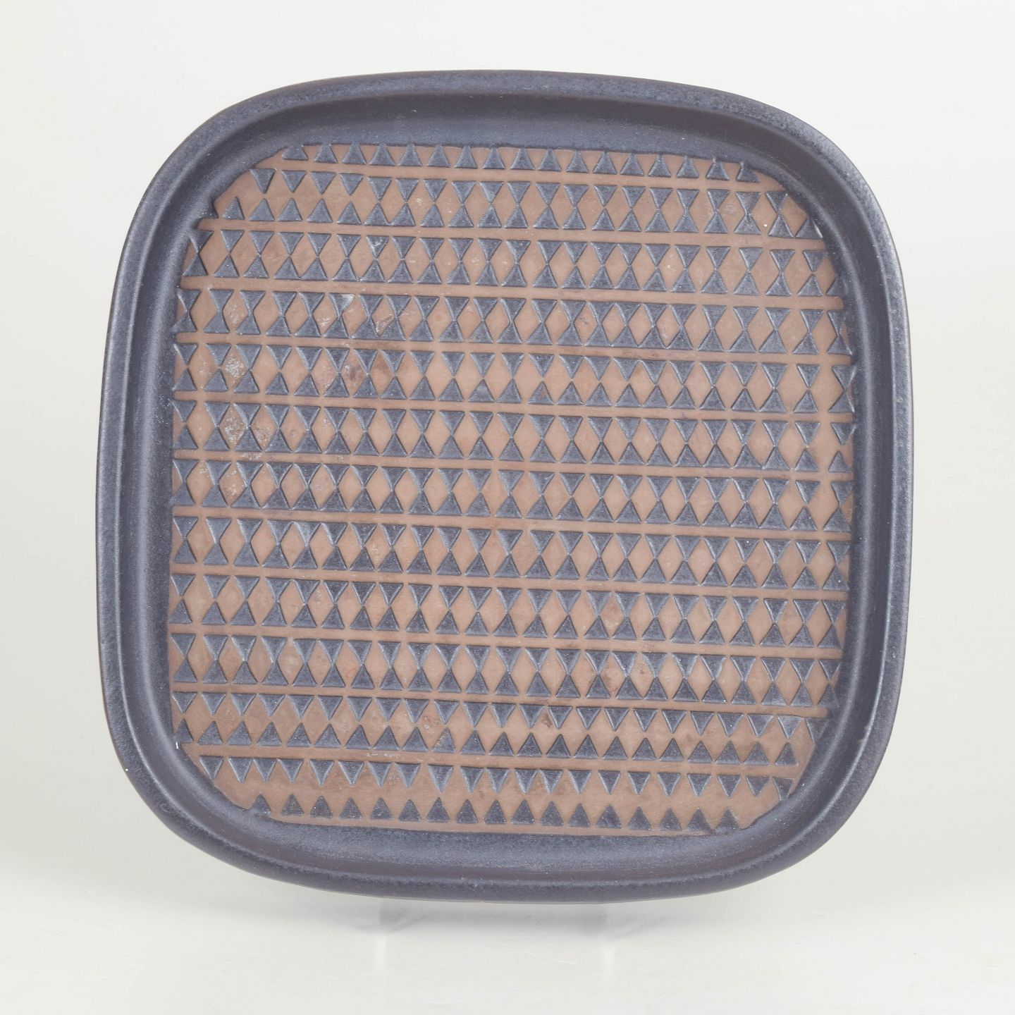 Mari Simmulson for Upsala Ekeby, stort fad.Stort kvadratisk fad i stentøj med afrundede hjørner og dekorativ overflade med gentaget trekantsmønster i brun og blå glasur. Let relief og karakteristisk grafisk udtryk. Med original etiket. Model 4095M.