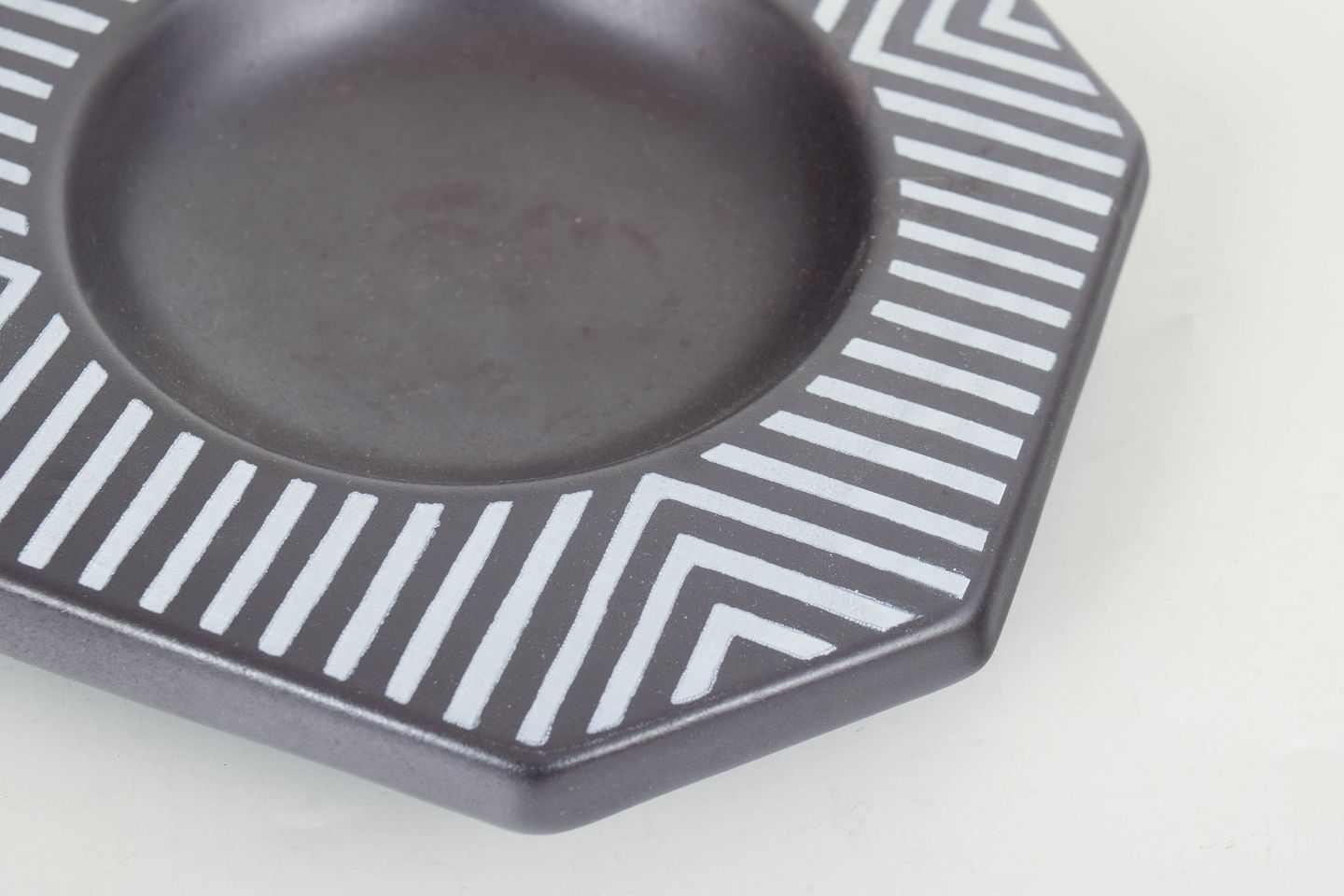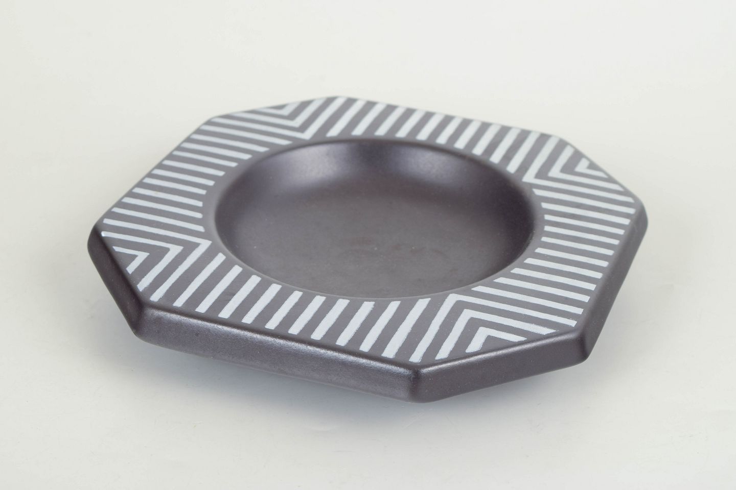 Mari Simmulson for Upsala Ekeby, fad.Dekorativt ottekantet fad i stentøj med grafisk dekoration i sort og hvid med stribede felter og geometrisk mønster. Model 4254.