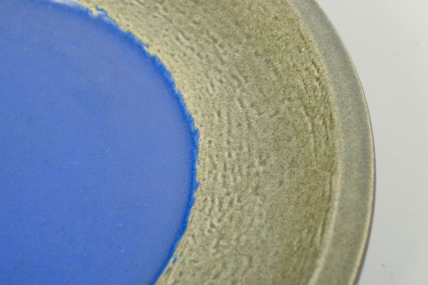Mari Simmulson for Upsala Ekeby, stort fad.Stort dekorativt fad i stentøj med bred rand i grøn glasur og centralt felt i klar blå tone. Let struktureret overflade med karakteristisk farvekontrast. Model 6001M.