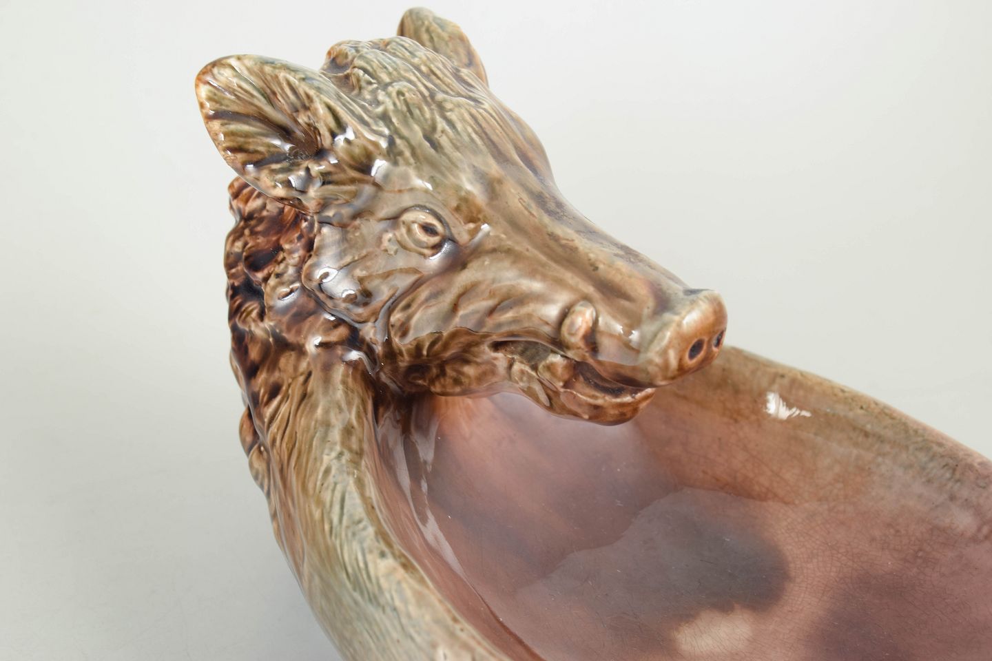 Höganäs, skål med vildsvin.Skål i stentøj udformet som et vildsvinehoved med naturalistiske detaljer og glaseret i varme brunlige og rosa nuancer. Dekorativ og funktionel genstand med karakteristisk tidlig 1900-tals formsprog.