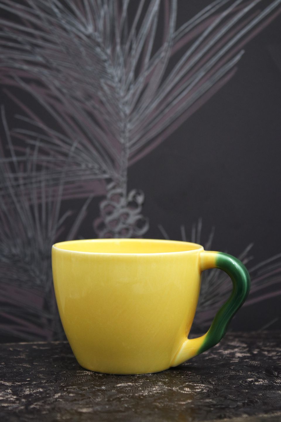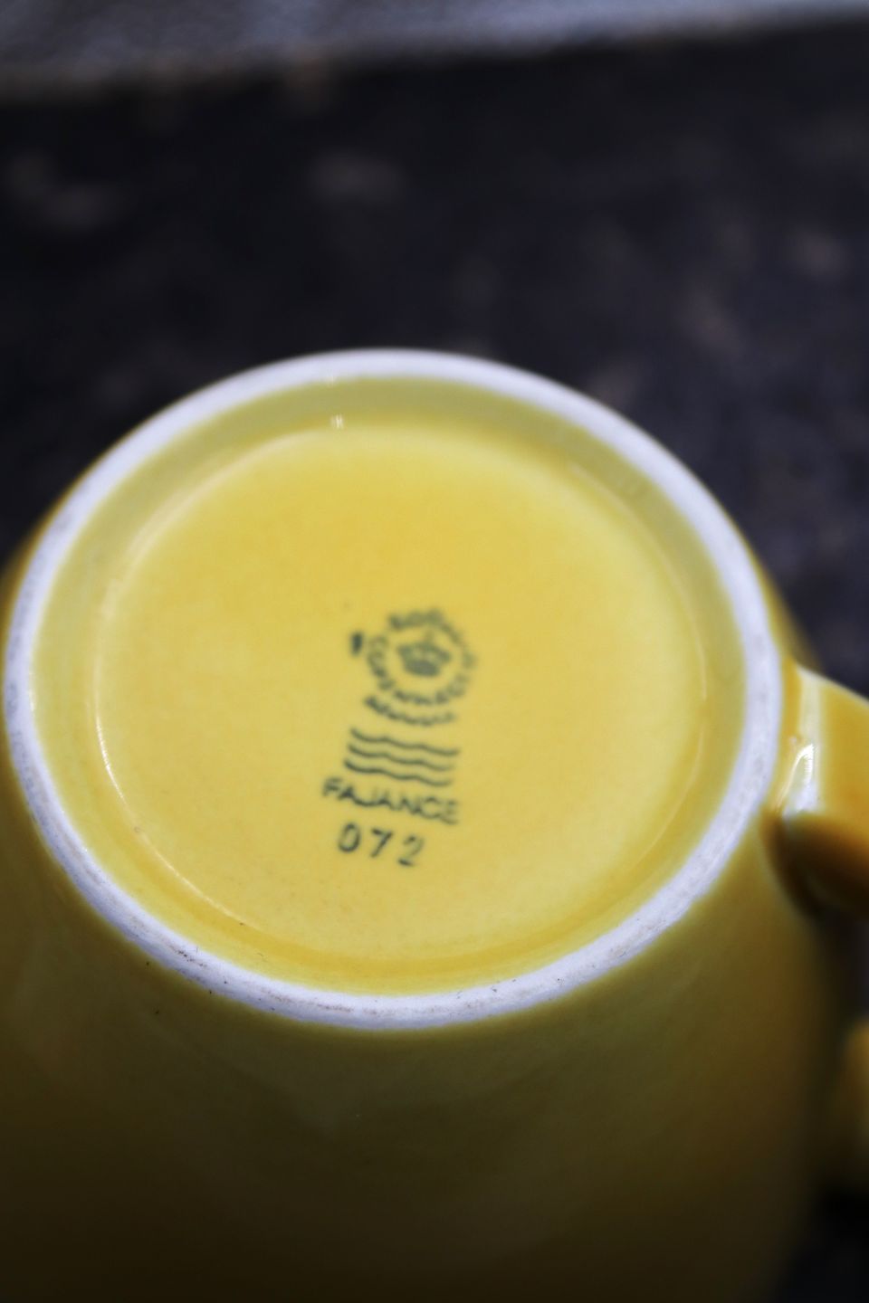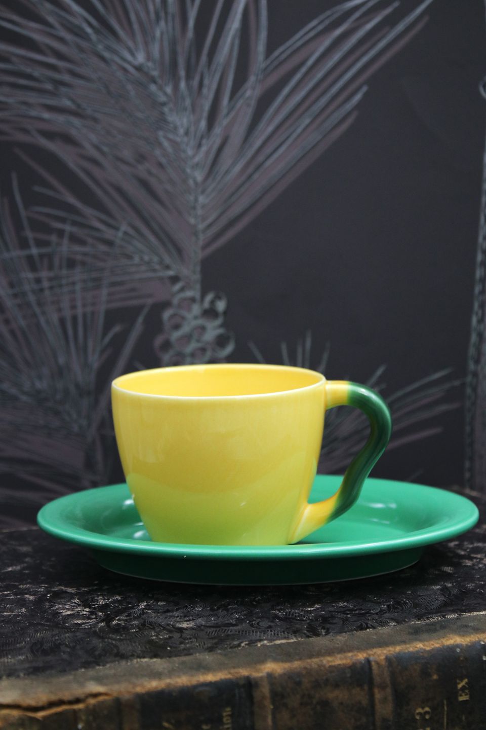 Ursula kaffekop i fajance fra Royal Copenhagen designet af Ursula Munch-Petersen , kaffekop i gul glasur med grøn hank og undertallerken i grøn glasur.
