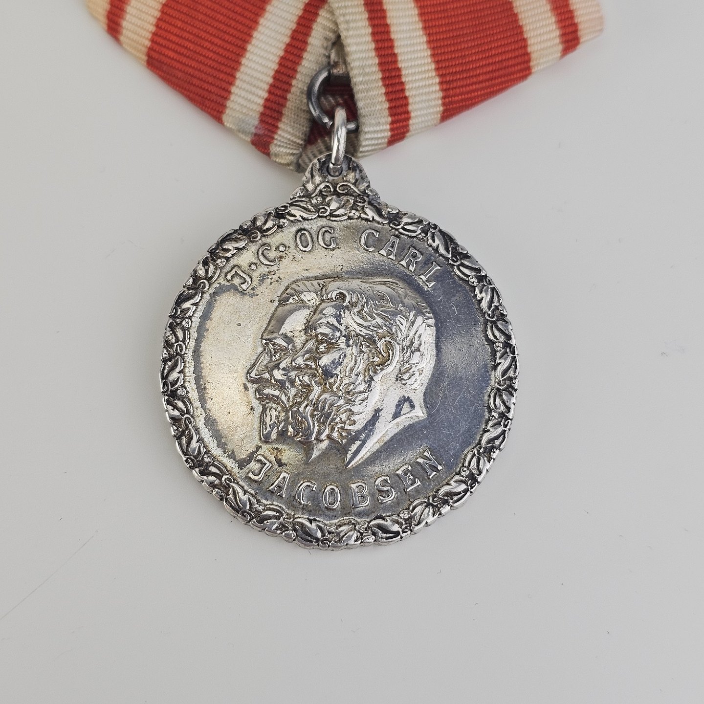 Medalje i sølv 999 med J.C. og Carl Jacobsen graveret på den ene side og "For trofast tjeneste" Carlsberg på den andenHøjde 8 cm