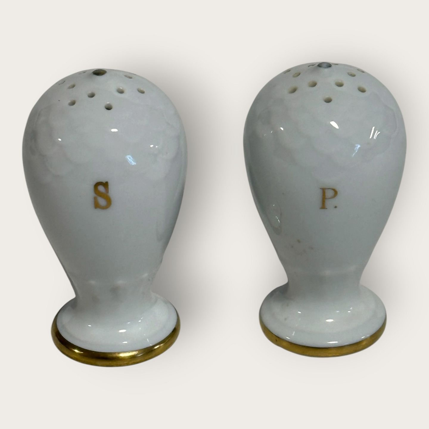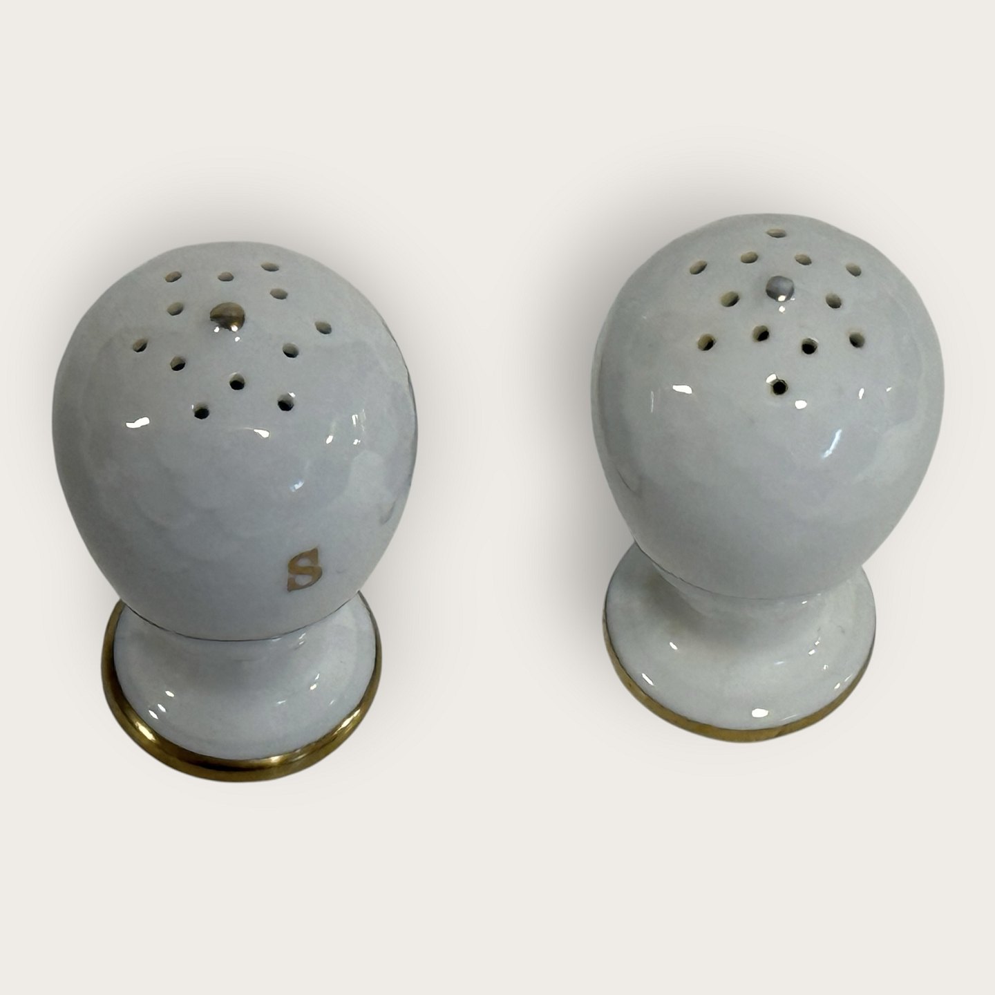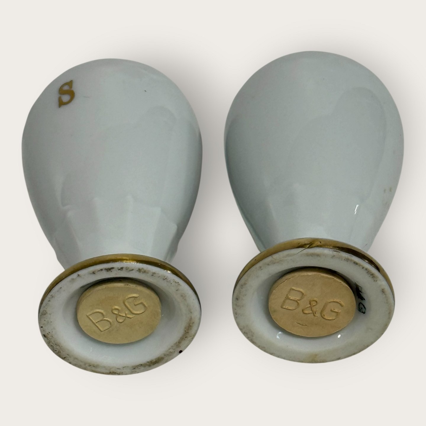 Bing & Grondahl, Aakjær, Weißes Porzellan mit Goldrand, Salz- und Pfefferstreuer, 7 cm hoch, 1. Wahl *Guter Zustand*