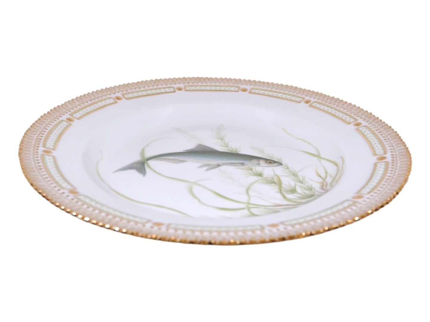 Royal Copenhagen Flora Danica, middagstallerken dekoreret med fisk.Dekorationsnummer 19/3549.