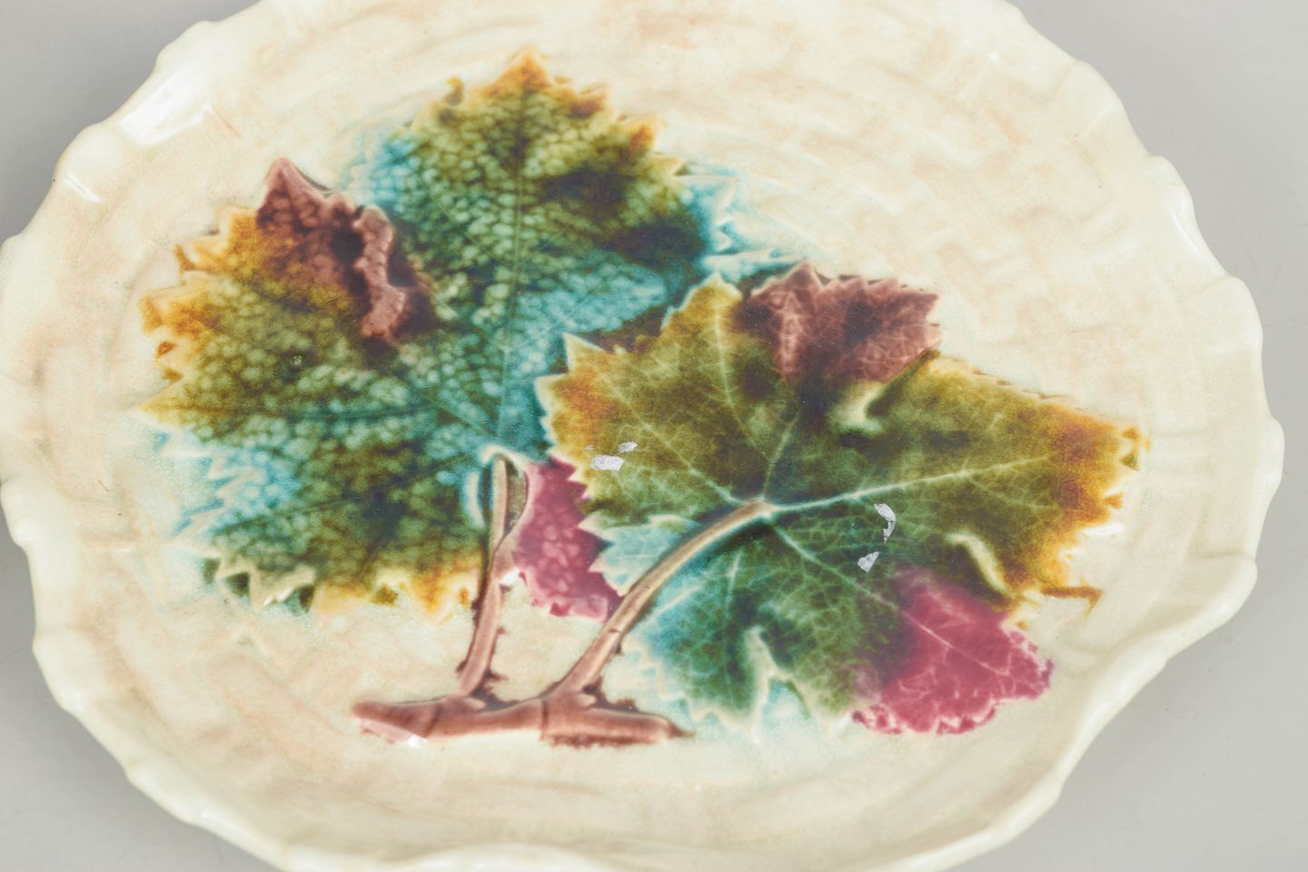 Gustavsberg majolika tallerkener, sæt af fem.Dekorative fajance tallerkener med relief og håndmalet dekoration i form af blade i flerfarvede glasurer.