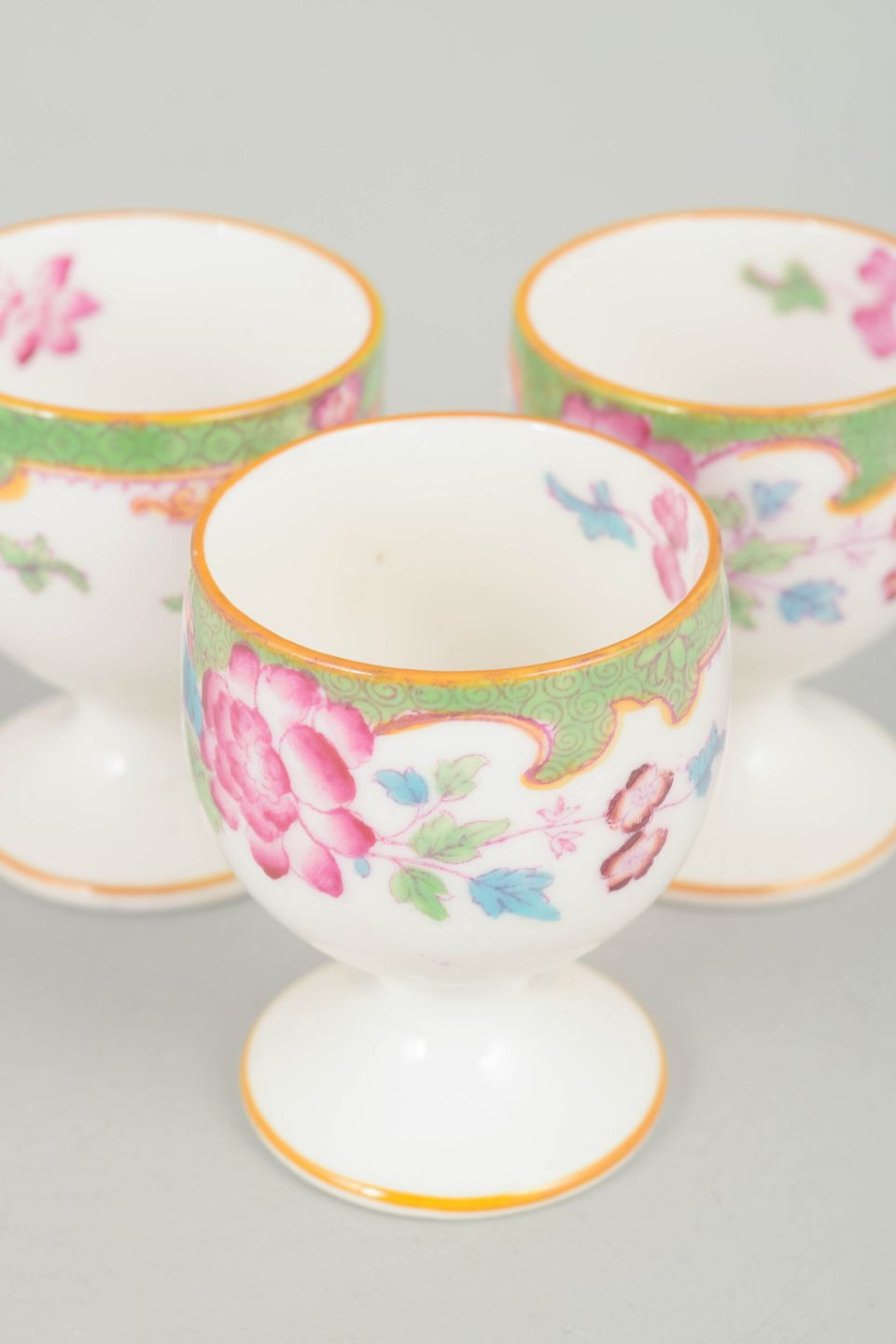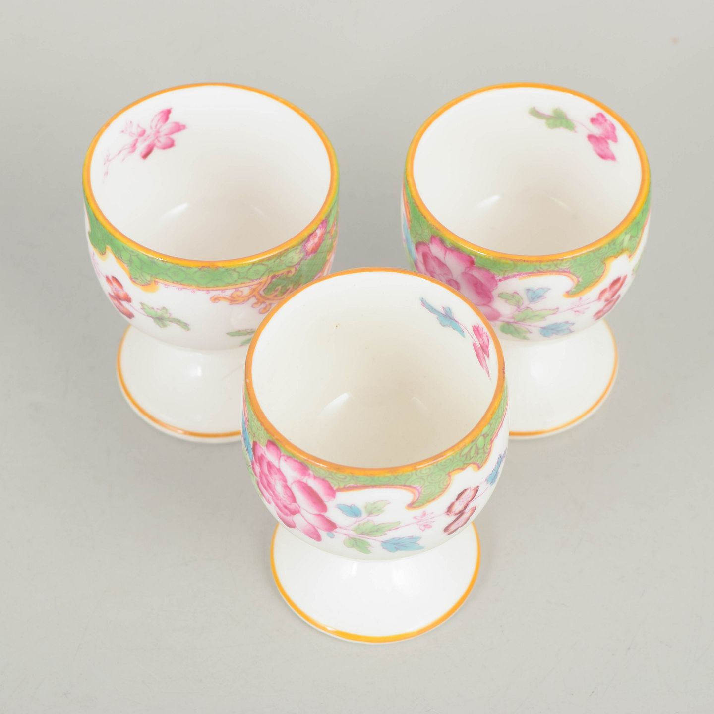 Royal Doulton "Temple", sæt af tre æggebægre.Dekorative æggebægre i porcelæn med farverig blomsterdekoration i Temple mønster og karakteristisk grøn bort.