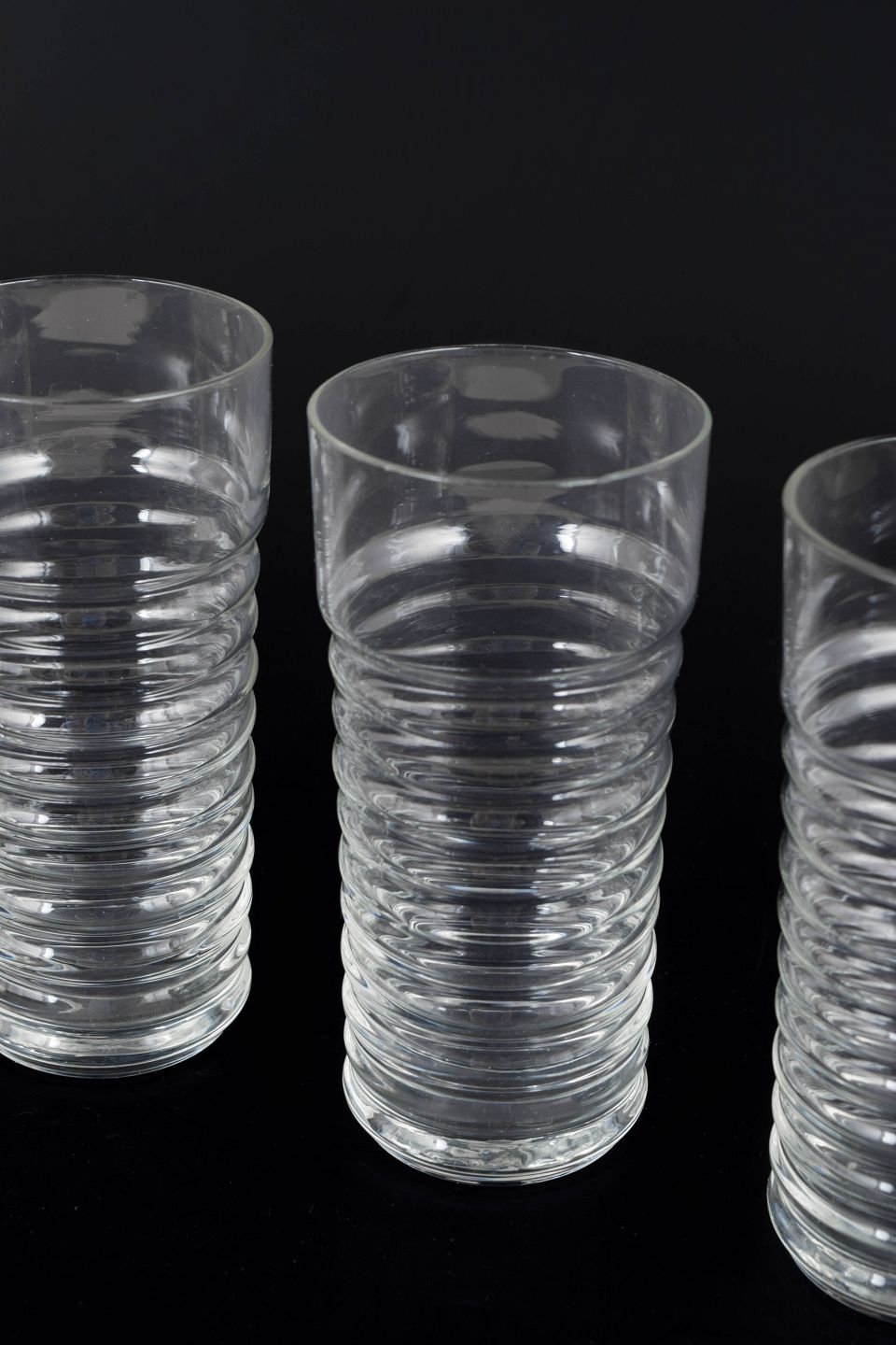 Nanny Still for Riihimäen Lasi, sæt af fire drikkeglas.Klar glas i Perpetum Mobile serien med karakteristisk rillet struktur og cylindrisk form.