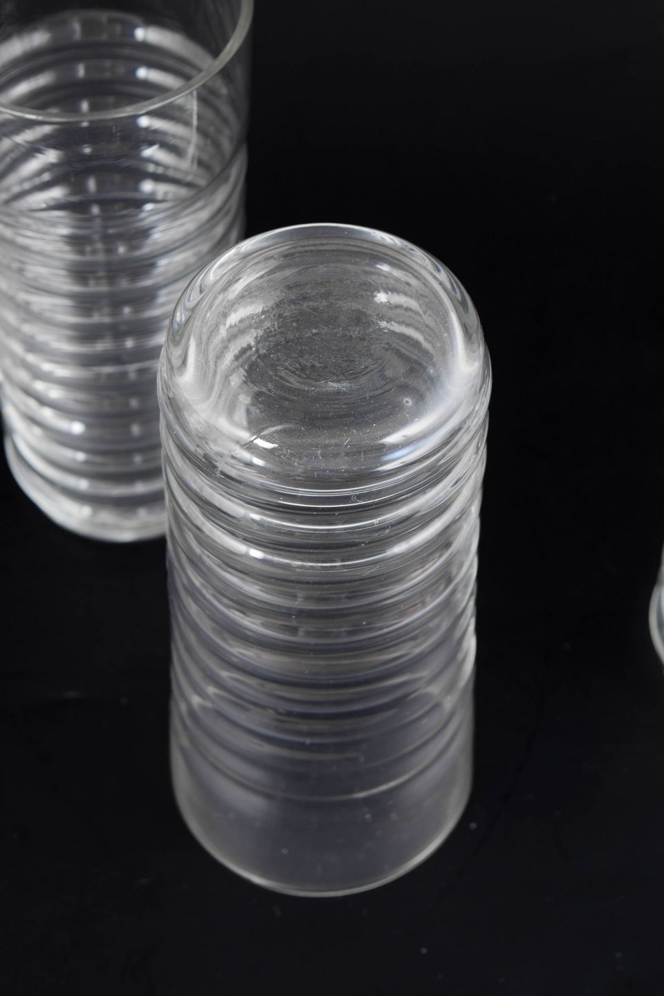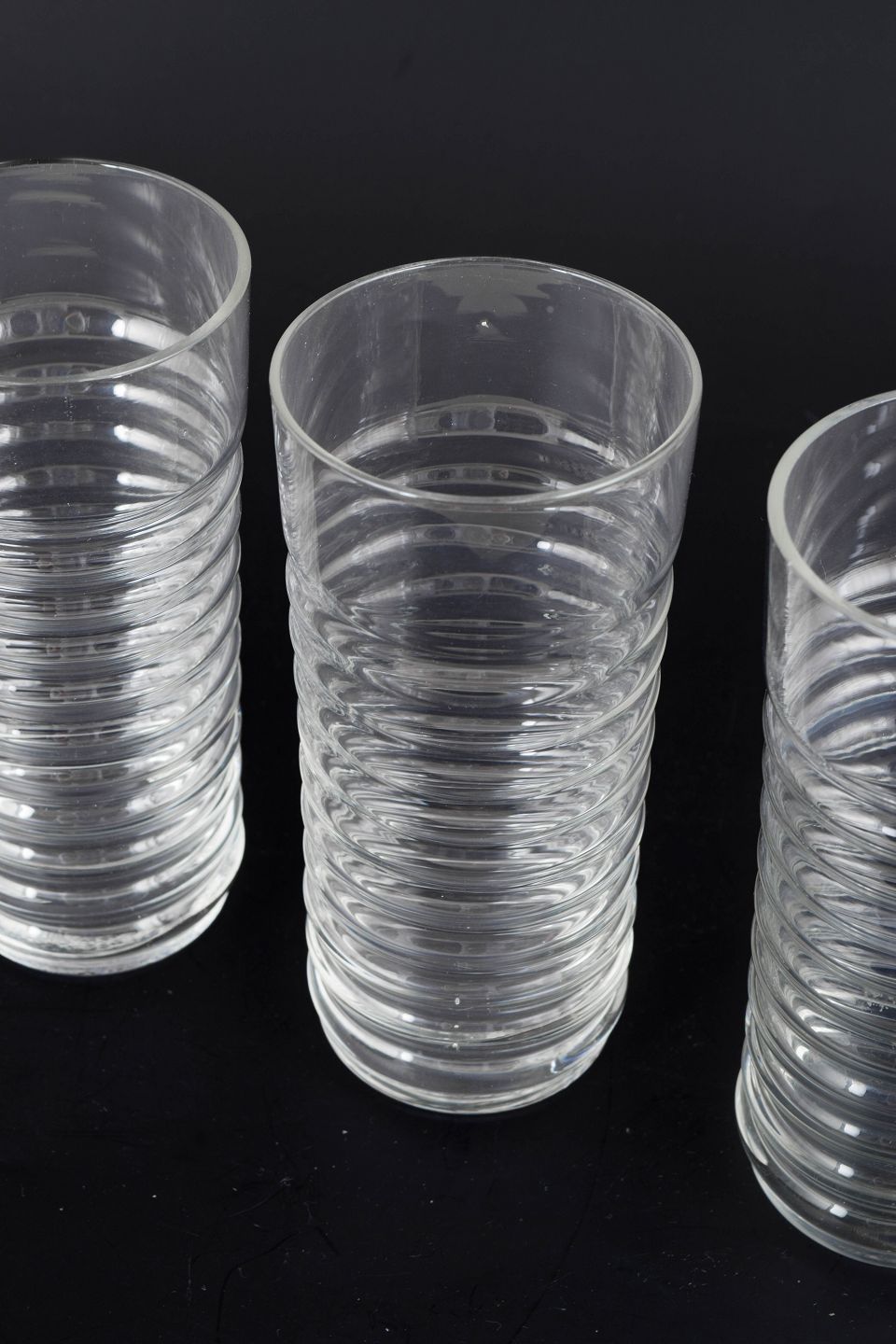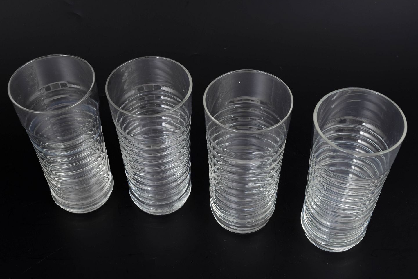 Nanny Still for Riihimäen Lasi, sæt af fire drikkeglas.Klar glas i Perpetum Mobile serien med karakteristisk rillet struktur og cylindrisk form.