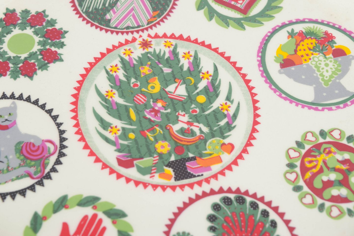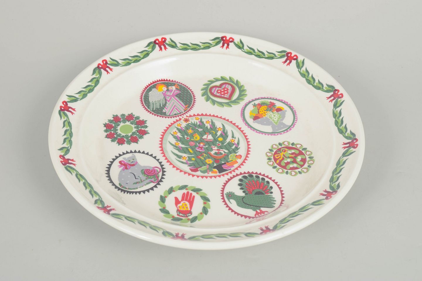 Susan Williams for Portmeirion, fad.Dekorativt porcelænsfad med flerfarvet motiv bestående af stiliserede figurer og ornamentale elementer arrangeret i cirkulære felter. Rigt dekoreret kant med grøn guirlande og røde sløjfer. Fremstår som et karakteristisk eksempel på britisk design fra 1980’erne.