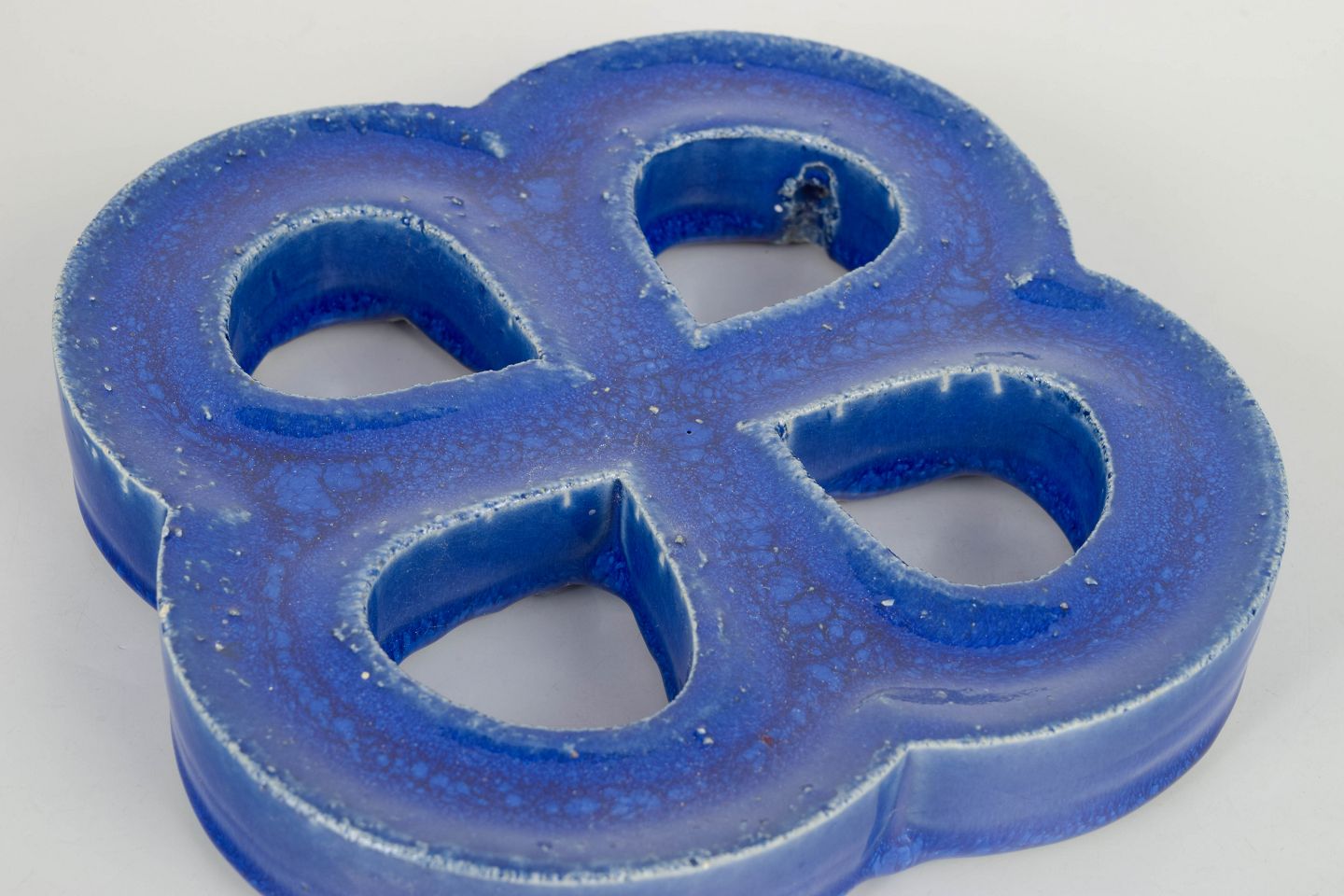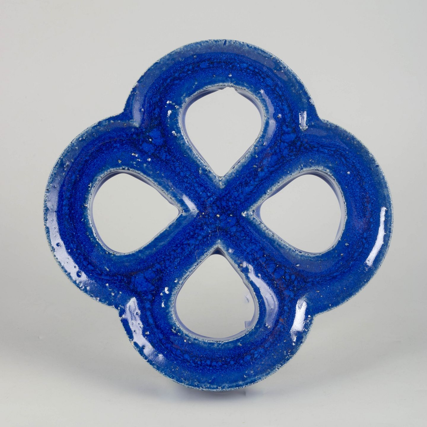 Gustavsberg vægrelief med ophæng.Dekorativt vægrelief i stentøj med organisk firkløverform og gennemgående åbninger. Udført med dyb blå, levende glasur med bobleeffekt og variation i overfladen. Bagside med hul til ophæng.
