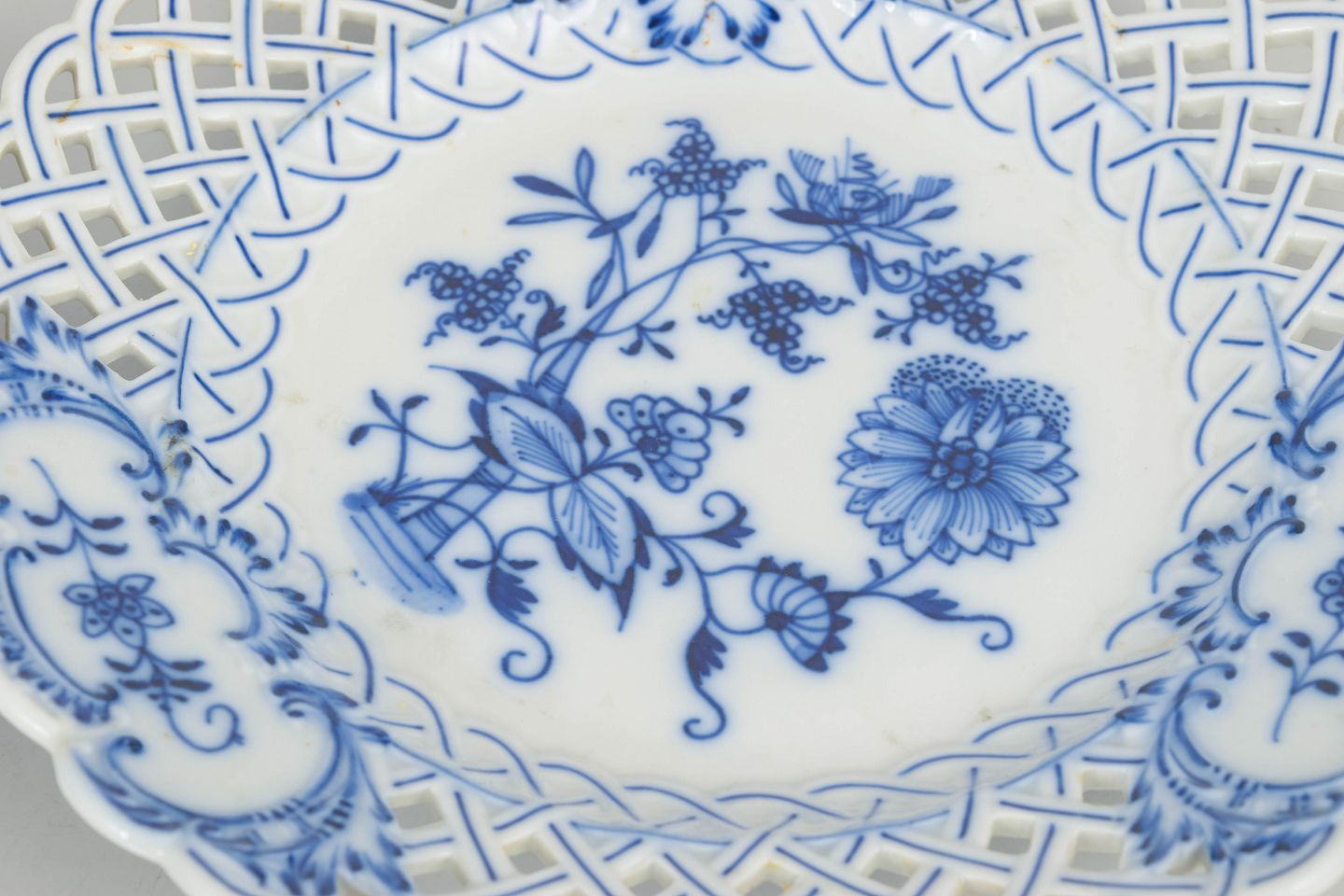 Stadt Meissen, to middagstallerkener.Klassiske middagstallerkener i porcelæn med gennembrudt fane og blå løgmønstret dekoration i underglasur. Elegant håndmalet udtryk med fin detaljering.