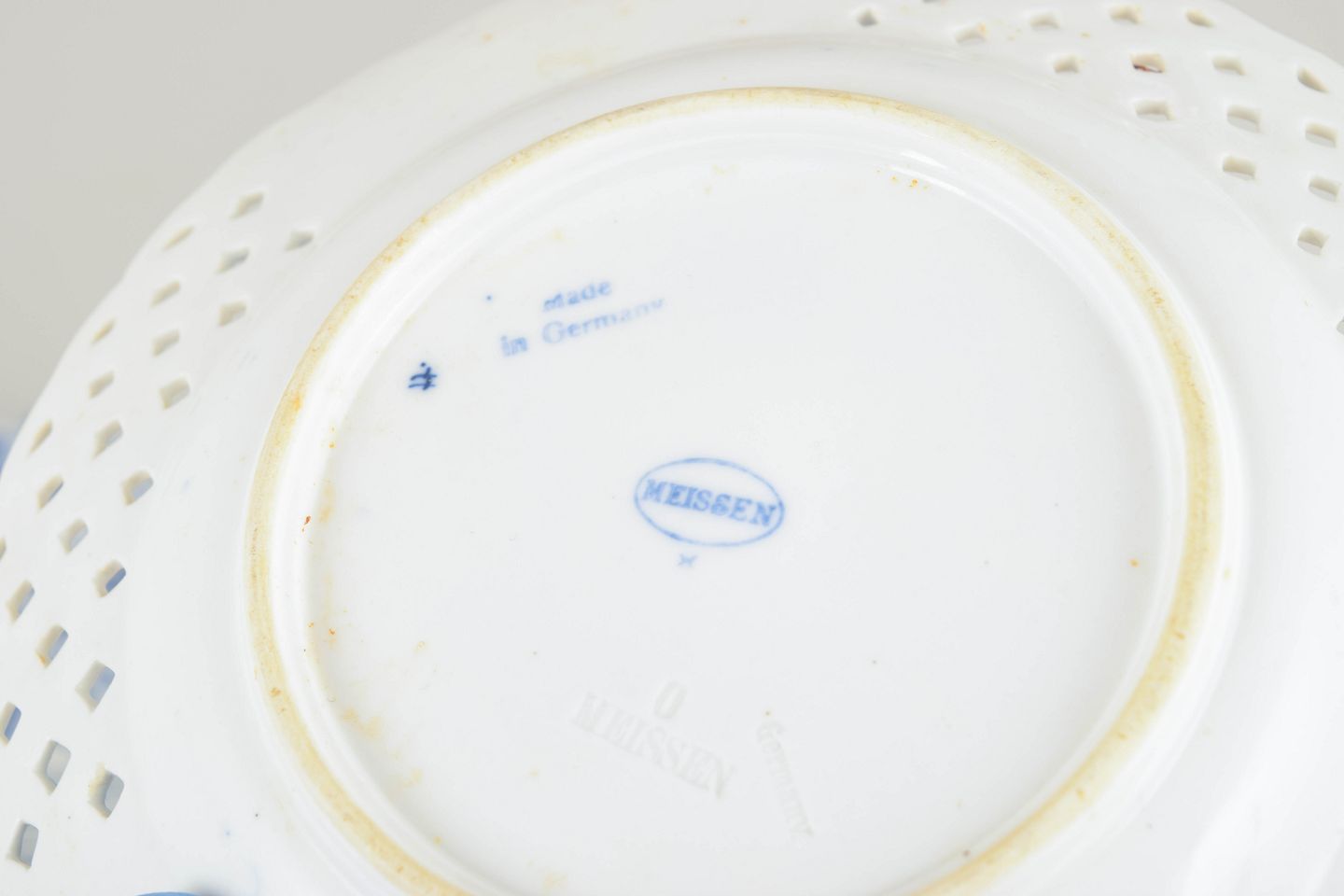 Stadt Meissen, sæt med seks salattallerkener.Klassiske salattallerkener i porcelæn med gennembrudt fane og blå løgmønstret dekoration i underglasur. Traditionelt håndmalet udtryk med fin detaljering.