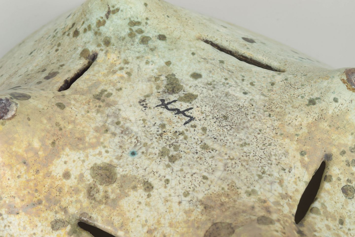 Hans Hedberg for Biot, lågskål.Organisk formet lågskål i stentøj med karakteristisk plettet glasur i lyse, jordnære toner. Skulpturel form med bløde linjer og låg med åbning, typisk for Hans Hedbergs keramiske arbejder fra Biot.