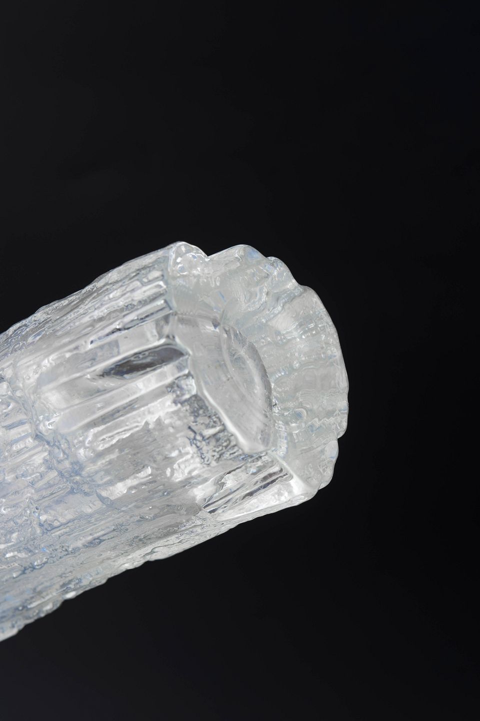Tapio Wirkkala for Iittala, vase.Klar glasvase med markant isstruktureret overflade og lodrette reliefmønstre inspireret af smeltende is. Høj, slank cylindrisk form med let ujævn kant.
