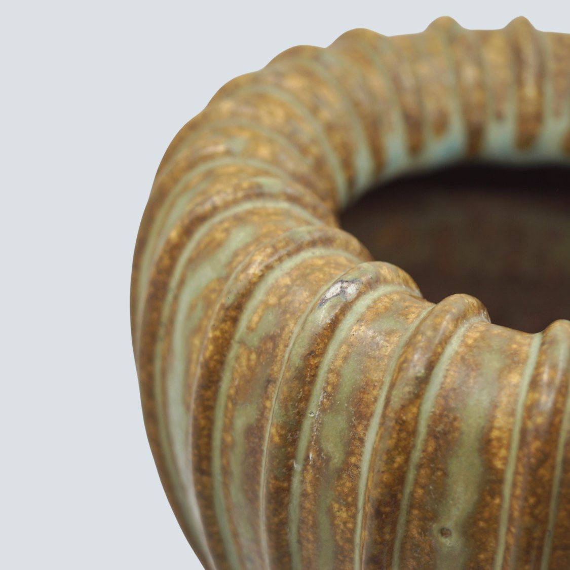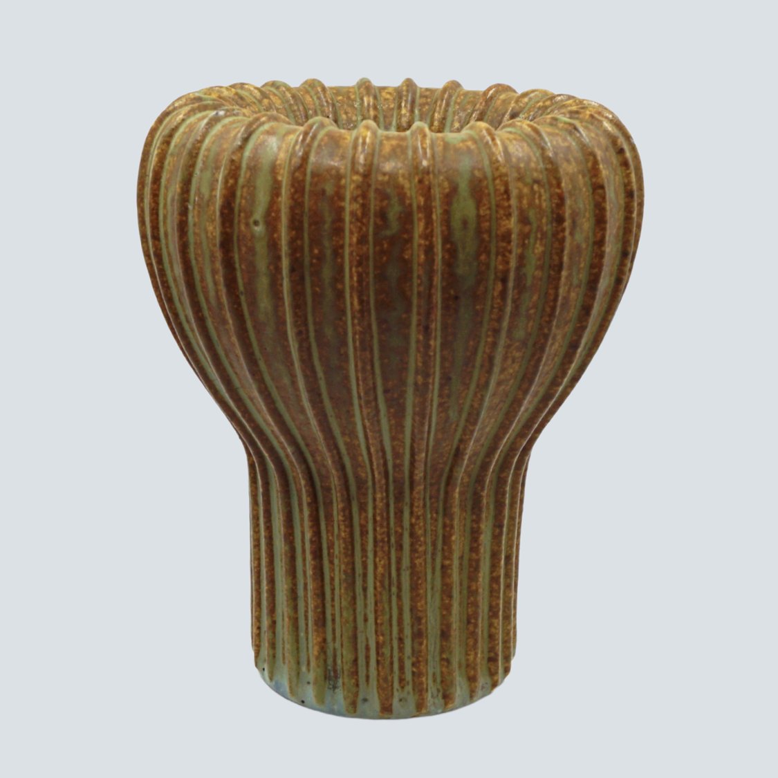 Arne Bang; Riflet vase af stentøj, nr. 139 Dekoreret med grønblå og brun glasur.Arne Bang. Dessin nr. 139.