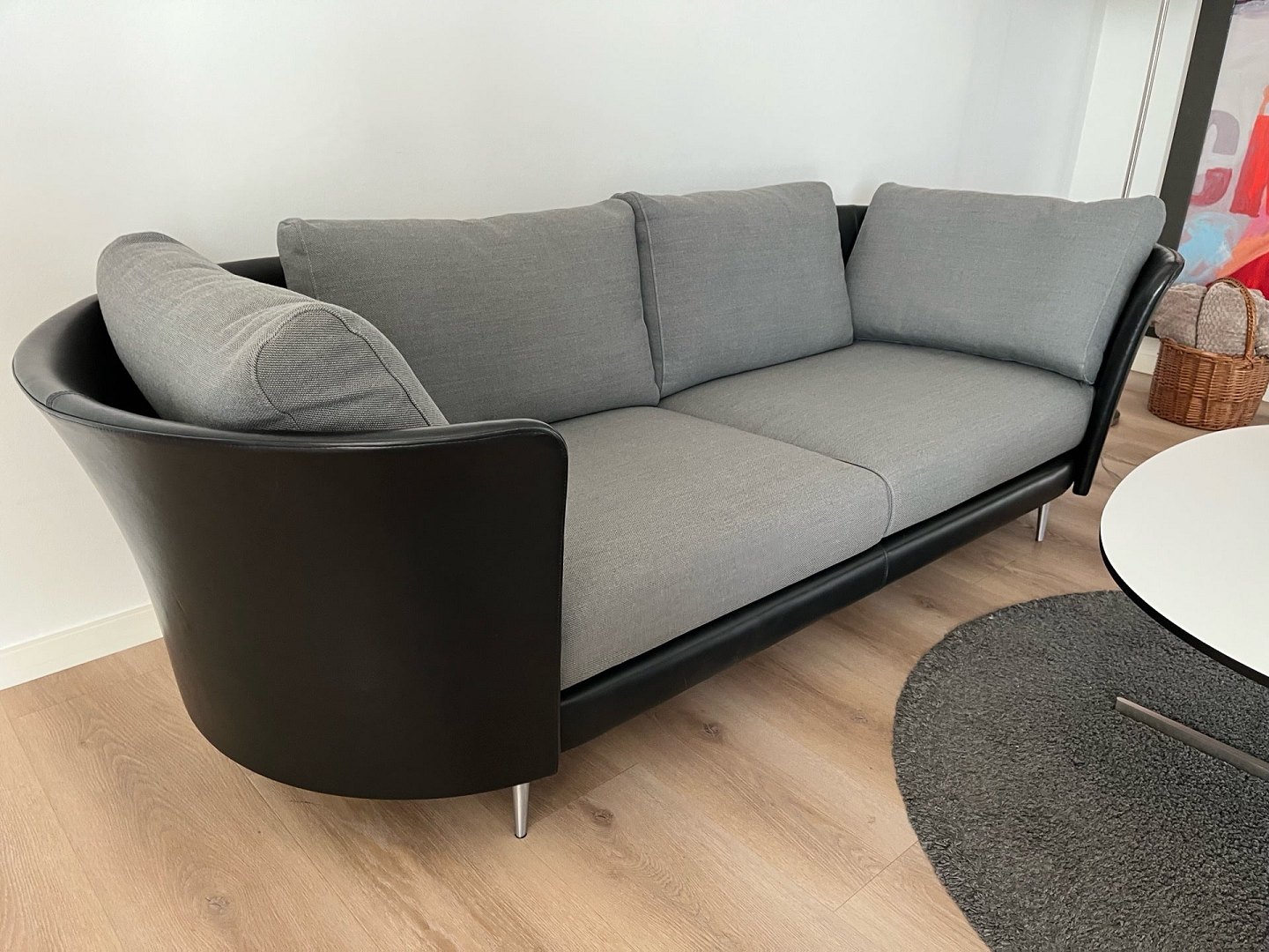 Exklusives Mogens Hansen Vascas Sofa in schwarzem Preston-Leder und Hallingdal-Stoff. Originalpreis: 51.975,-. Dieses exklusive Vascas Sofa von Mogens Hansen besticht durch sein hervorragendes Design und kombiniert schwarzes Preston-Leder mit hochwertigem Hallingdal-Stoff. Das Sofa ist mit eleganten Spike-Fußleisten ausgestattet. Die Beine in matter Ausführung unterstreichen das stilvolle Design. Die Uhr wurde im März 2020 geboren und hatte nur einen Besitzer. Sie stammt aus einem Nichtraucherhaushalt ohne Haustiere und Kinder und wurde nur wenig täglich im Wohnzimmer benutzt. Der Riemen ist daher nahezu neuwertig und in einem sehr guten Zustand. Das Design zeichnet sich durch eine eng geschwungene Außenschale aus, die einen schönen Kontrast zum weichen, bequemen Stoff bildet. Das Modell Vascas kombiniert Leder und Stoff an Gestell und Kissen und unterstreicht so den charakteristischen Ausdruck des Sofas. Es entsteht ein elegantes Zusammenspiel zwischen dem straffen Äußeren und dem einladenden Inneren Händler
