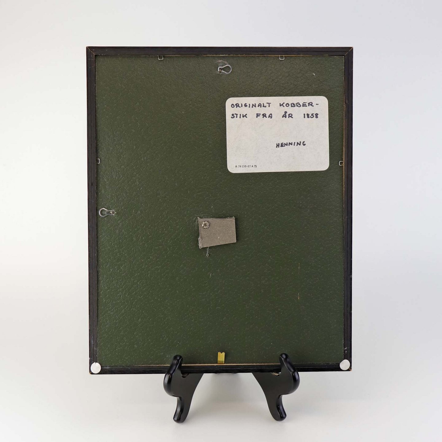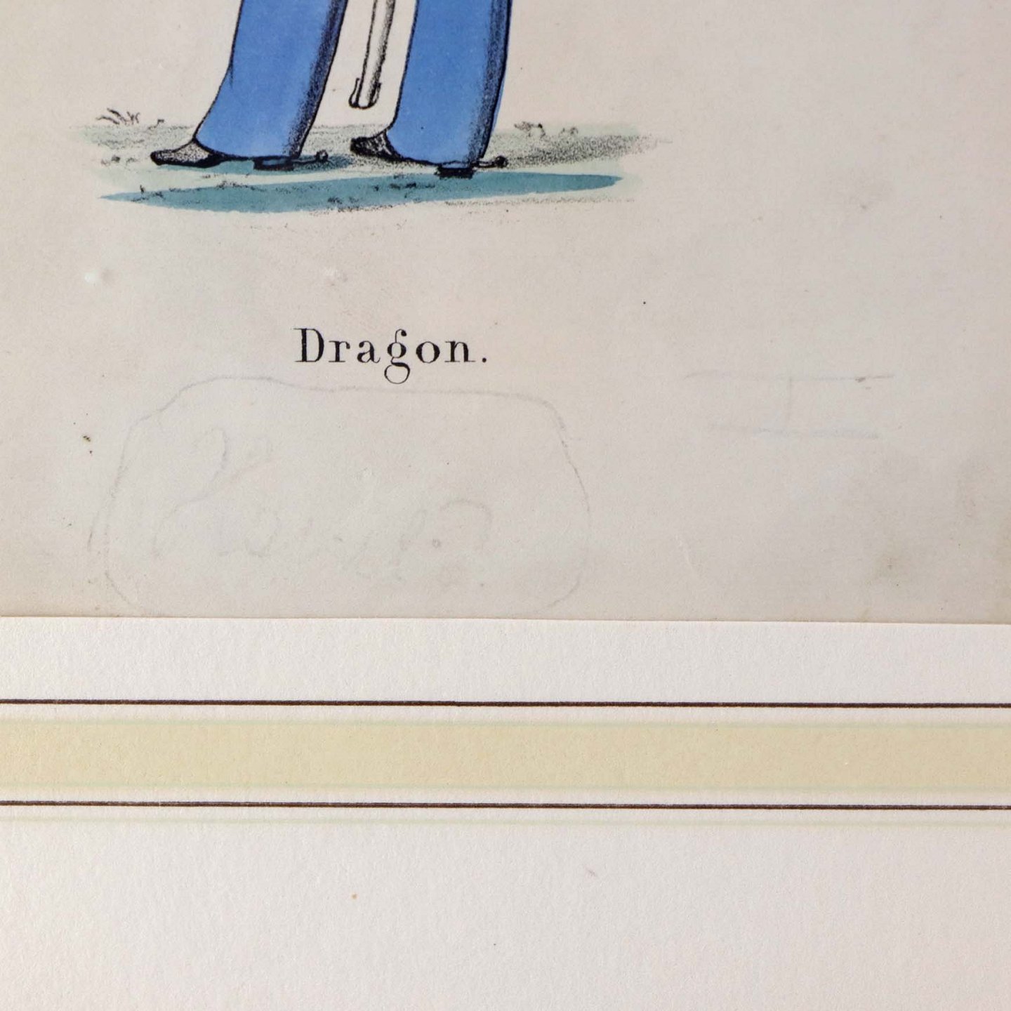 Originalt kobberstik fra år 1858 i træramme med teksten Dragon og motiv af en soldat i blå uniform.Kunstner ukendt