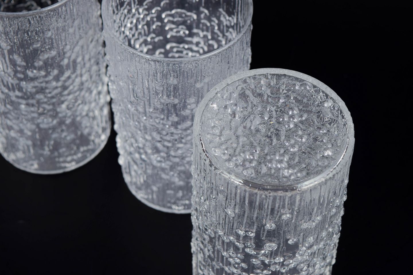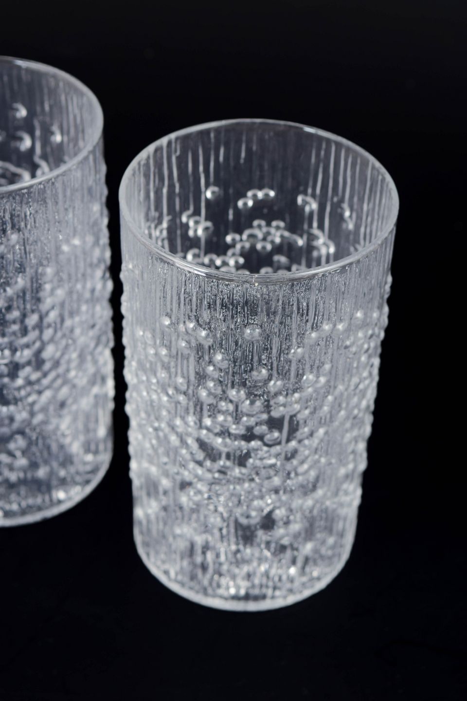 Tapio Wirkkala for Iittala, sæt af fire drikkeglas "Hopla" serien.Sæt af fire drikkeglas i presset glas med karakteristisk organisk struktur og reliefmønster, der skaber et levende lysspil i overfladen. Designet er et klassisk eksempel på finsk glasdesign fra perioden. Model Hopla i klart glas.