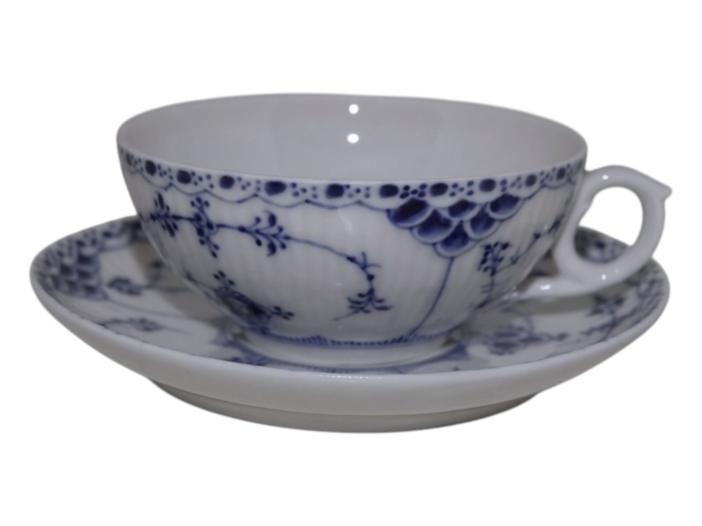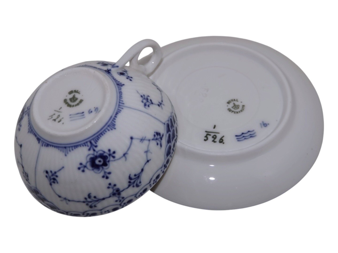 Royal Copenhagen Musselmalet Halvblonde, lille chokoladekop med tilhørende underkop.Dekorationsnummer 1/526.