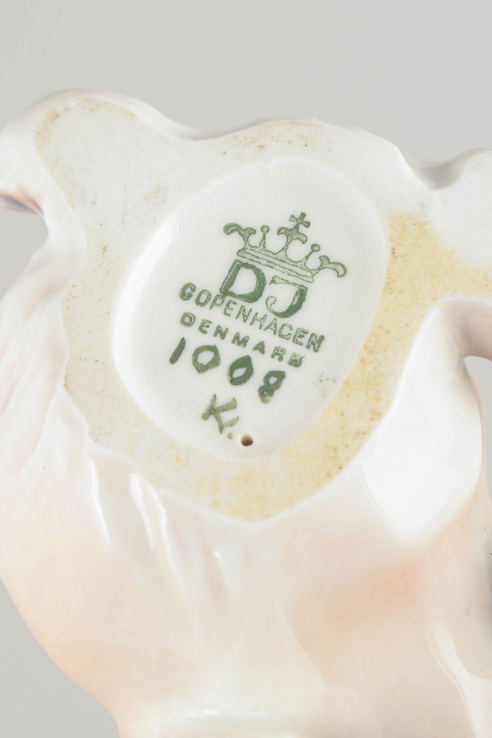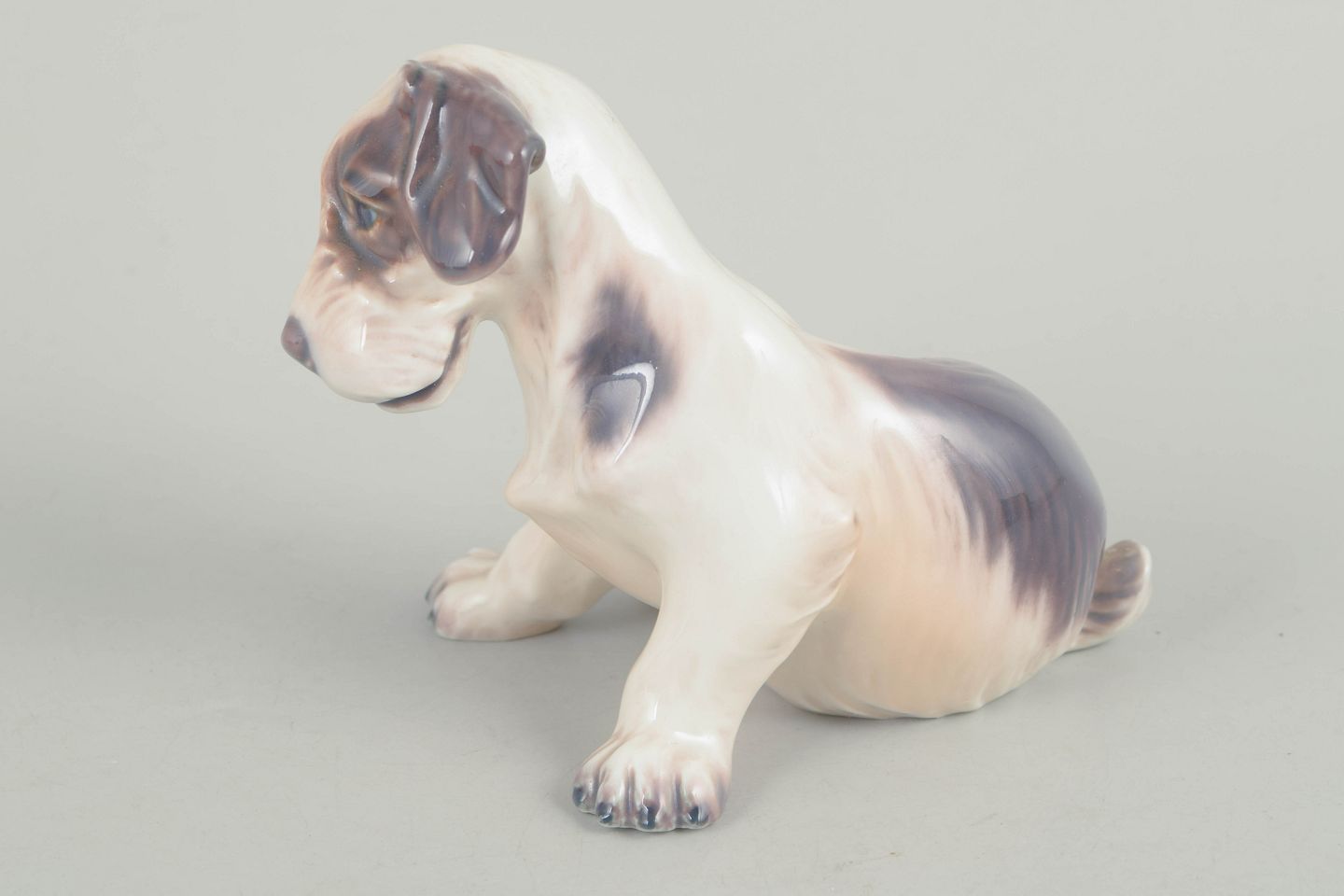Dahl Jensen, porcelænsfigur af hund.Naturalistisk udført porcelænsfigur af siddende hund med bløde former og fint modellerede detaljer. Glaseret i afdæmpede nuancer med brungrå markeringer. Model 1008.