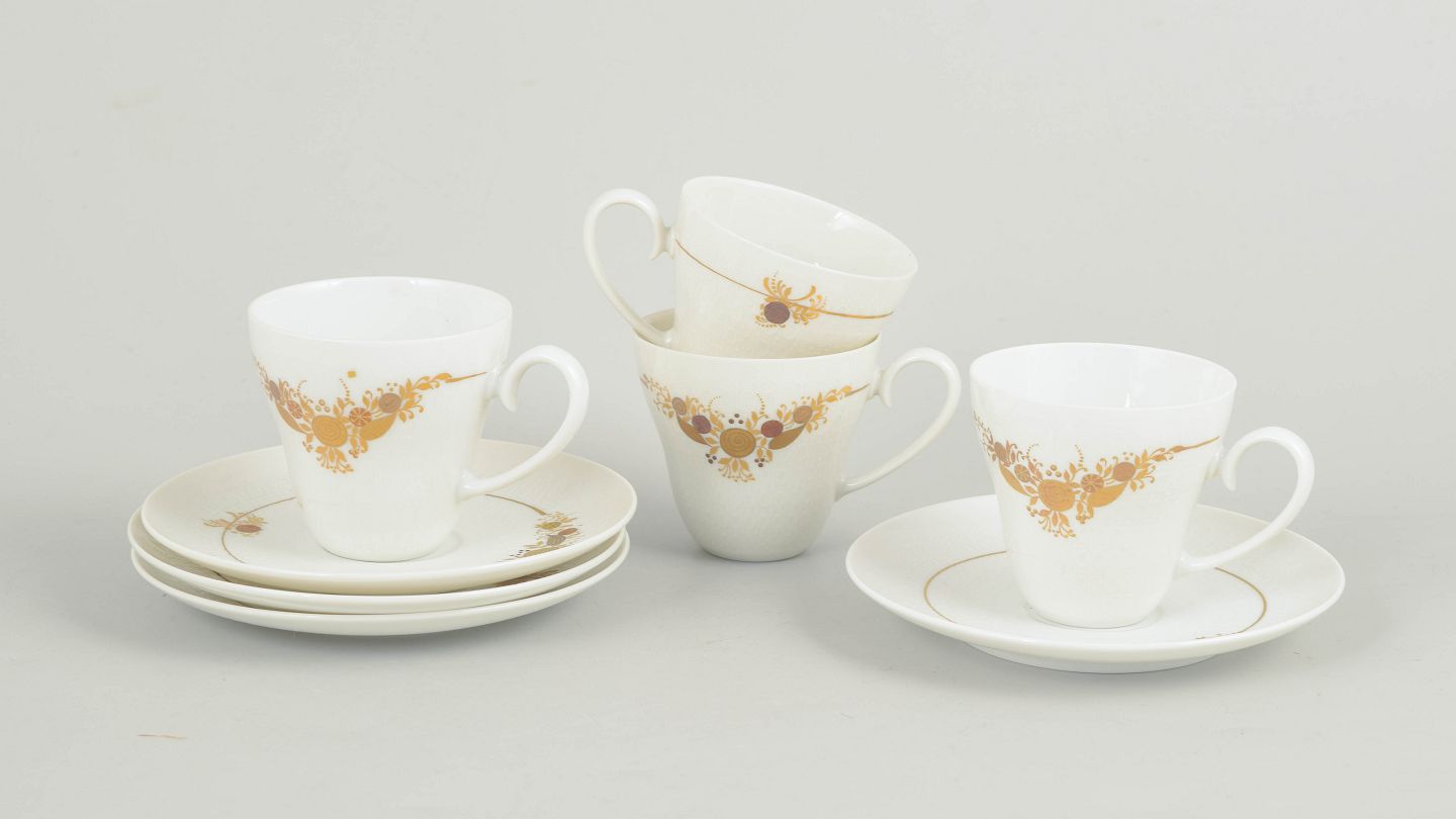 Bjørn Wiinblad for Rosenthal, sæt af fire kaffekopper med underkopper.Sæt bestående af fire kaffekopper med tilhørende underkopper i porcelæn dekoreret med det karakteristiske blomsterornament fra Romanze-serien. Dekorationen fremstår i gyldne nuancer med fine detaljer og et elegant, romantisk udtryk, typisk for Wiinblads formsprog i 1970’erne.
