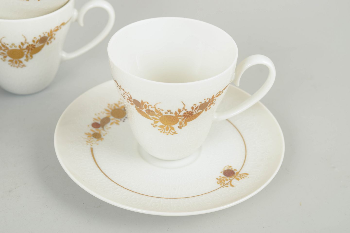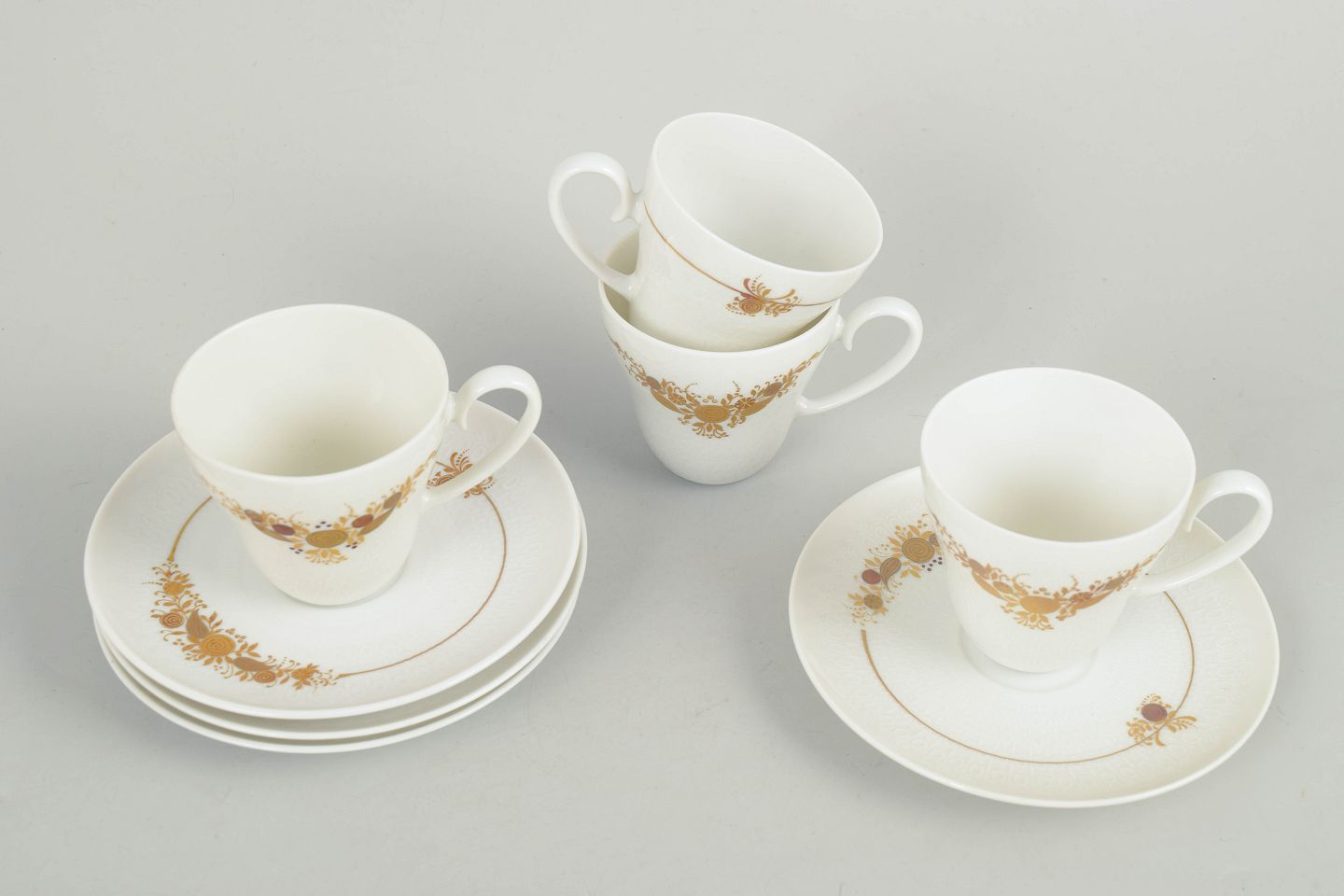 Bjørn Wiinblad for Rosenthal, sæt af fire kaffekopper med underkopper.Sæt bestående af fire kaffekopper med tilhørende underkopper i porcelæn dekoreret med det karakteristiske blomsterornament fra Romanze-serien. Dekorationen fremstår i gyldne nuancer med fine detaljer og et elegant, romantisk udtryk, typisk for Wiinblads formsprog i 1970’erne.