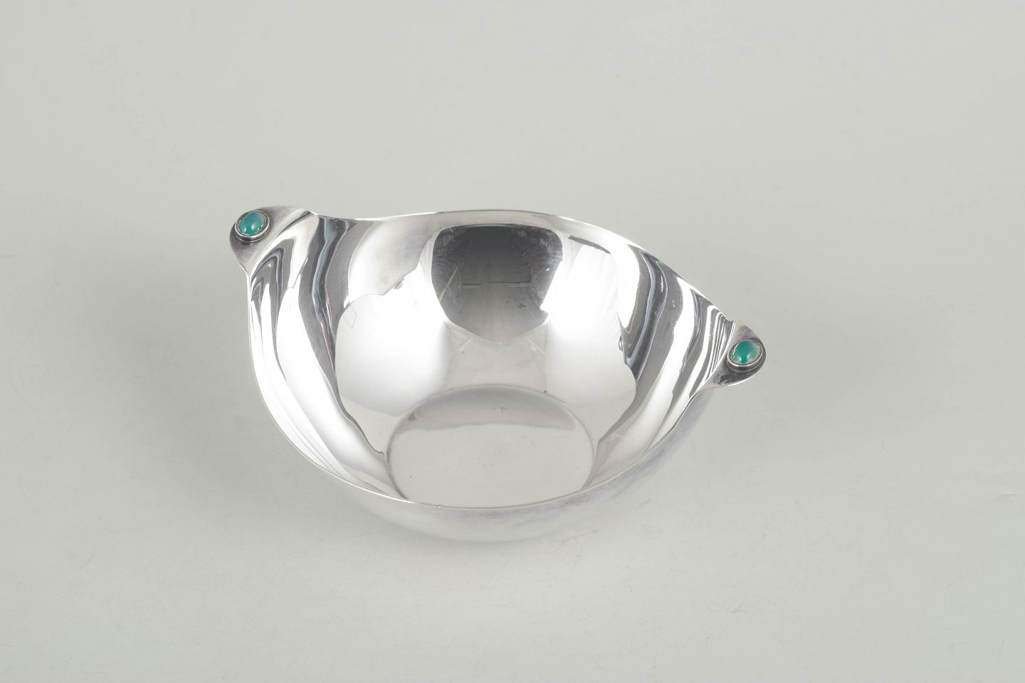 Vera Ferngren, skål i sterlingsølv med grønne jade sten.