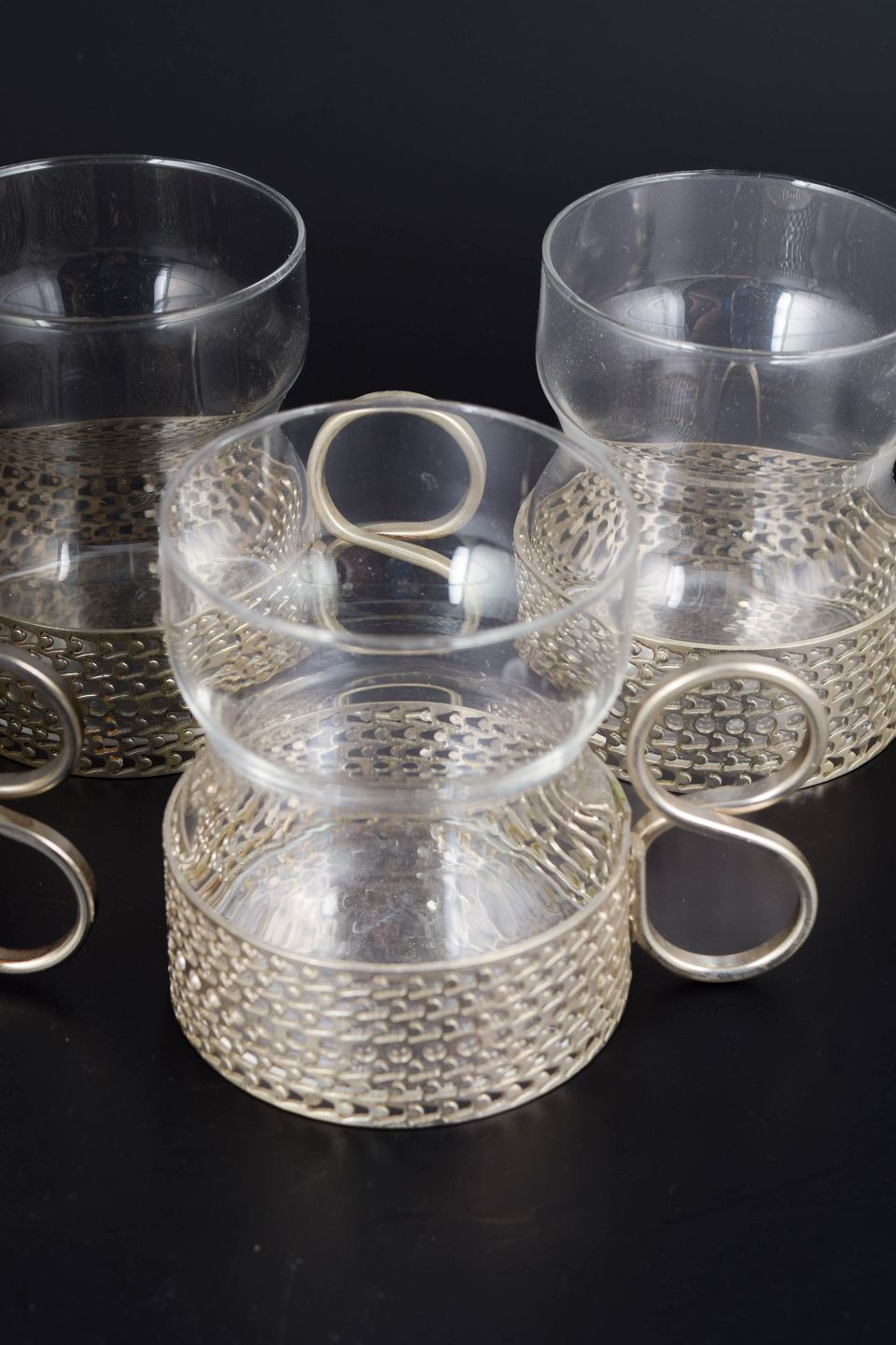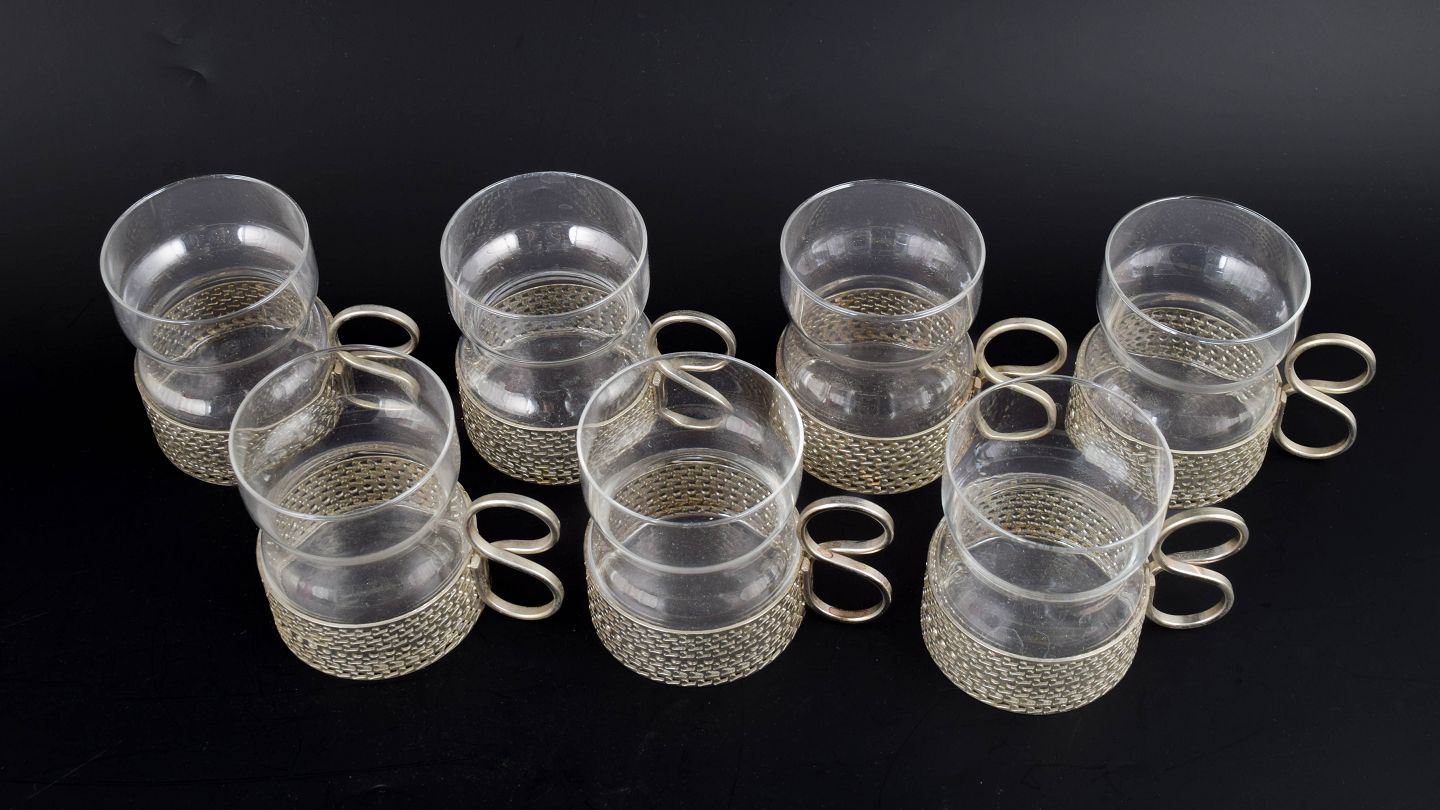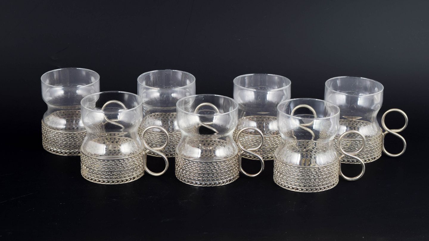 Timo Sarpaneva for Iittala, sæt af syv teglas med holder.Karakteristiske teglas fra Tsaikka-serien i klart glas med tilhørende metalholdere og hank, velegnet til te eller varm drik, designet i 1970’erne.