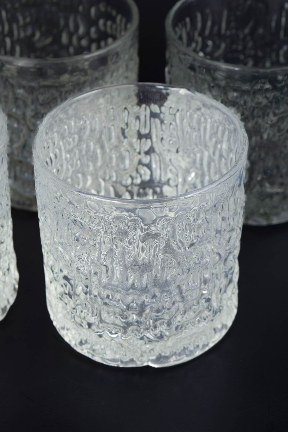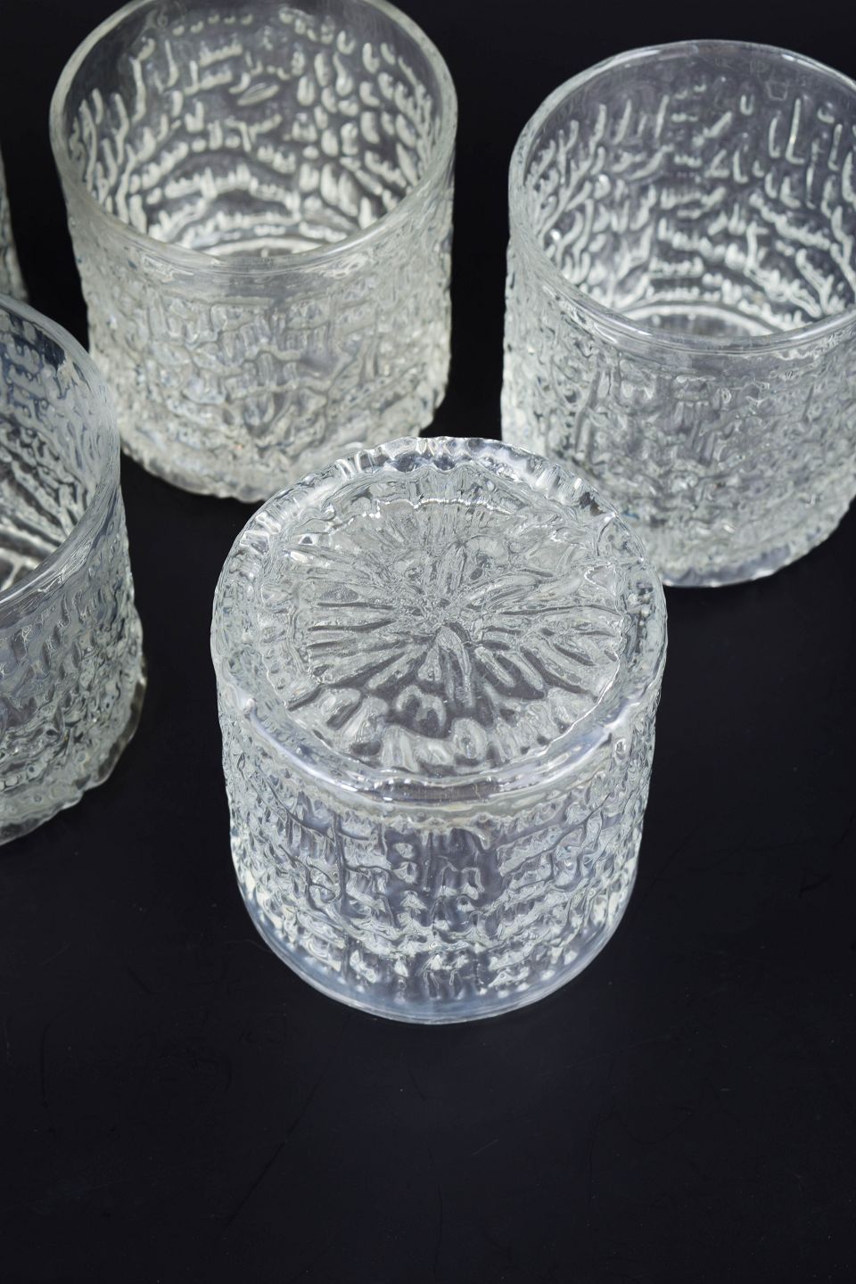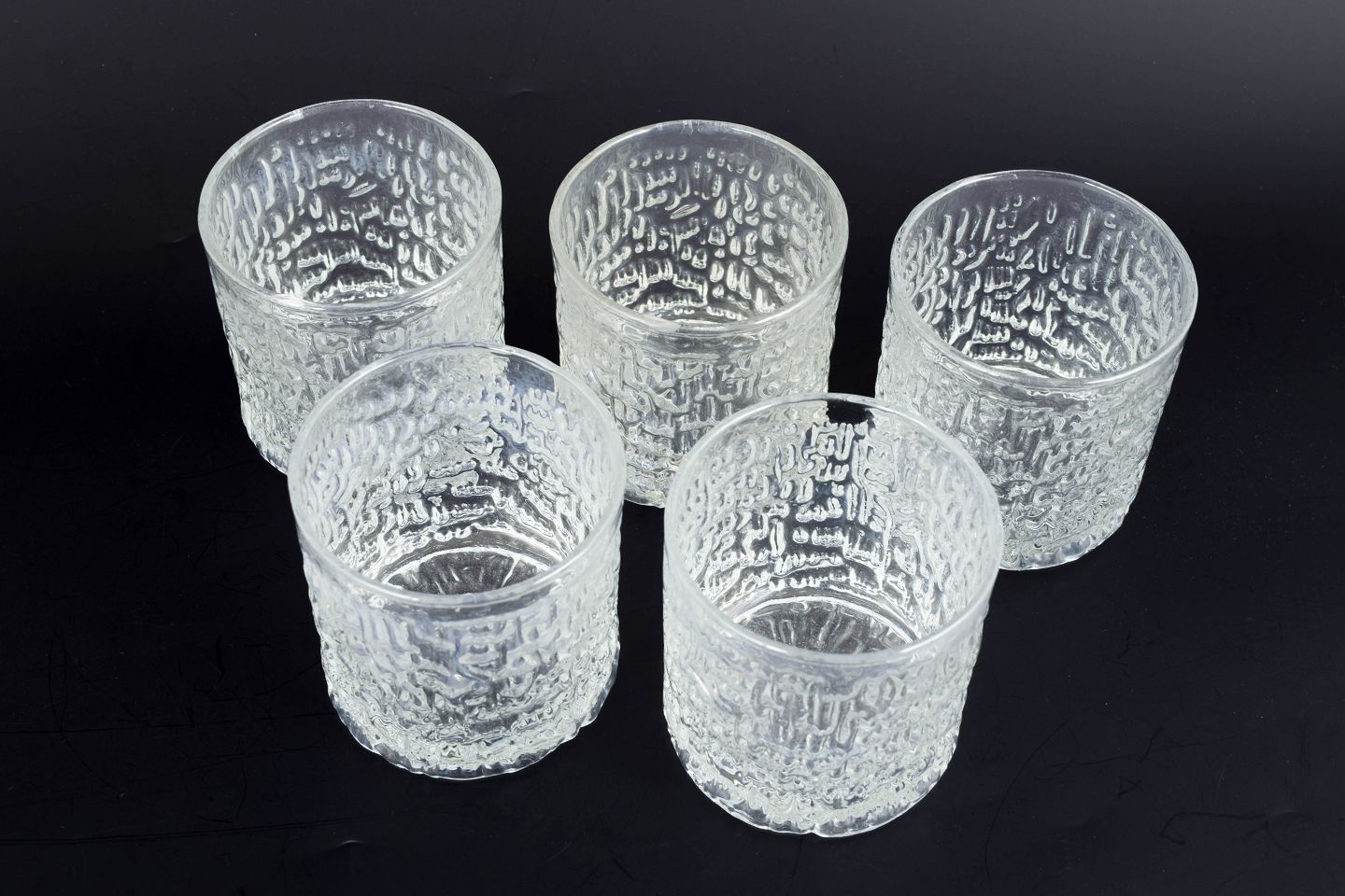 Ravenhead, sæt af fem whiskyglas “Siesta”.Klassiske whiskyglas i klart presset glas med dekorativ struktur og kraftig bund, model “Siesta”. Produceret i England i 1980’erne.