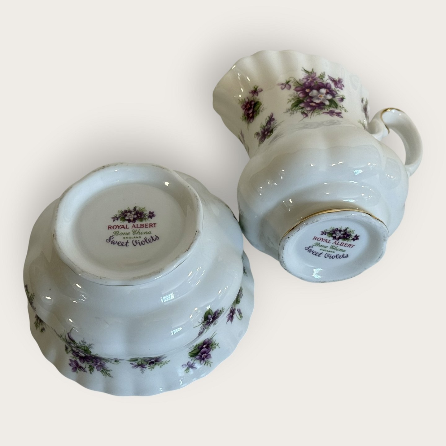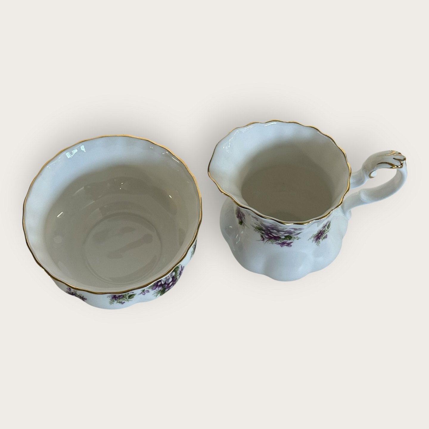 Royal Albert, Bone China, Duftrichtung: Süße Veilchen, Feldveilchen, Zuckerdose, Sahnekännchen-Set, Durchmesser der Zuckerdose: 9 cm, Höhe des Sahnekännchens: 9 cm *Perfekter Zustand*Lager: 1