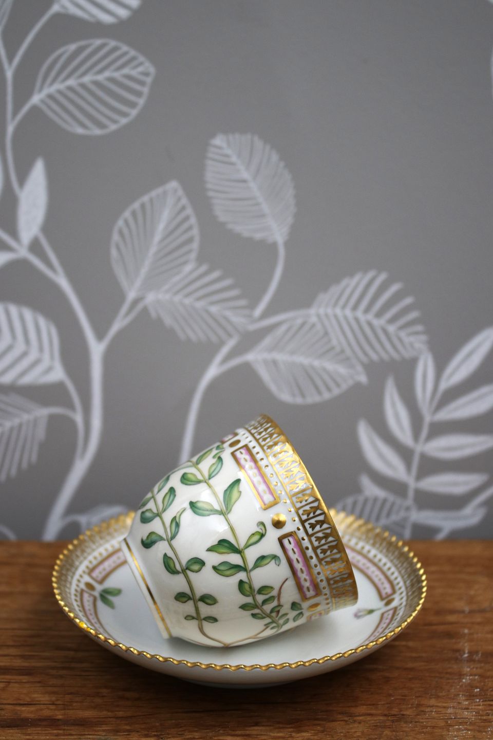 Mocca kop uden hank med underkop i Flora Danica-stel fra Royal Copenhagen.