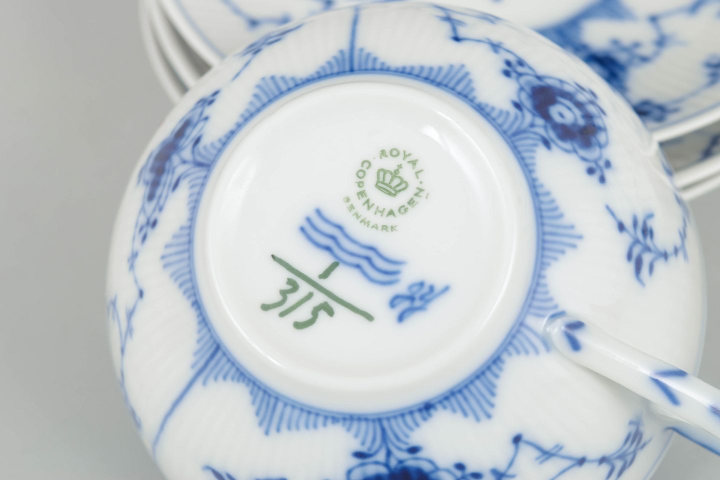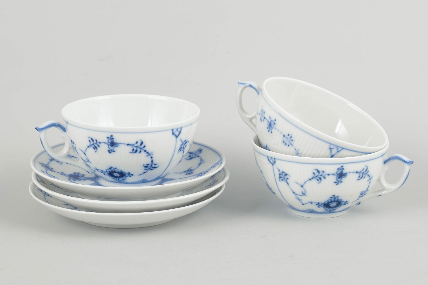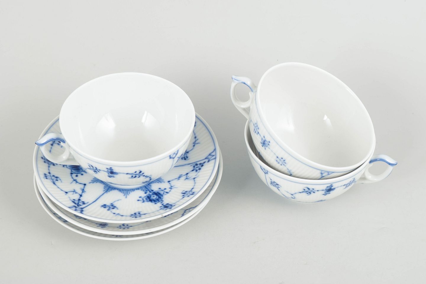 Royal Copenhagen Musselmalet Riflet, sæt af tre tekopper med underkopper.Beschreibung: