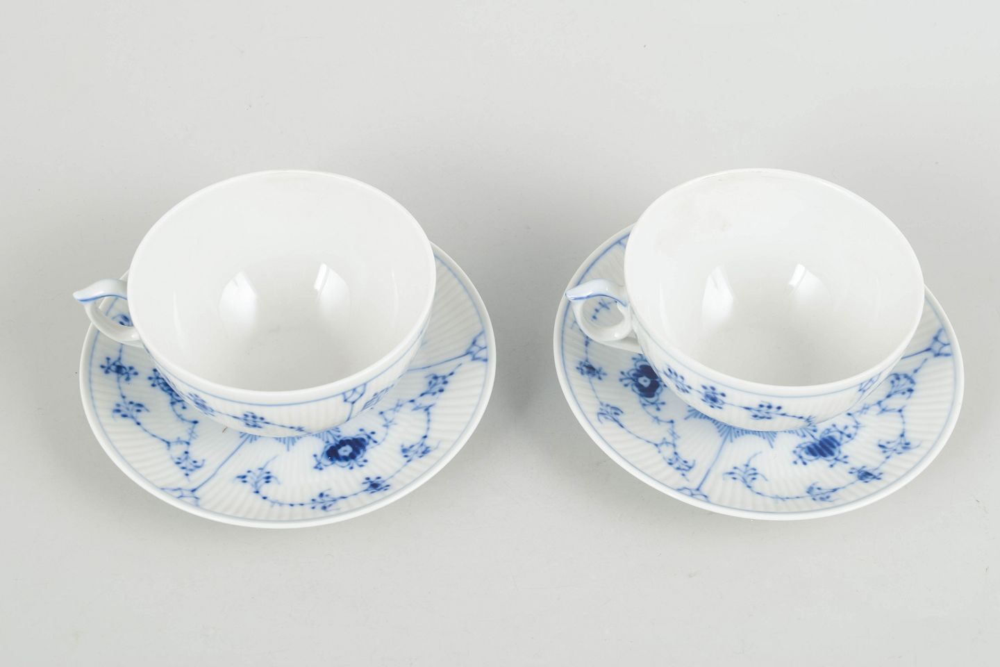 Royal Copenhagen Musselmalet Riflet to tekopper med underkopper.Beschreibung: