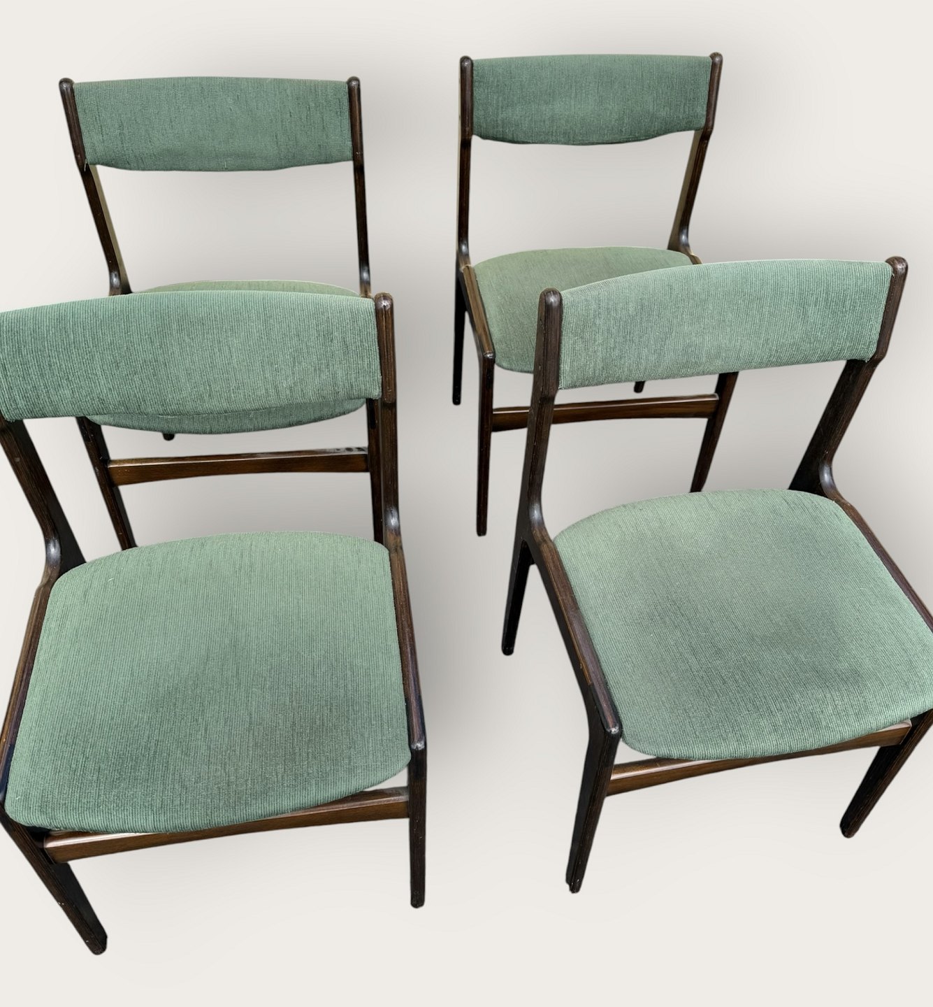 4 Stühle aus dunkel gebeiztem Holz, dänisch modern aus den 1960er Jahren, die Stühle sind stabil und in gutem gebrauchten Zustand, aber der Bezug ist fleckig/locker.Lager: 1