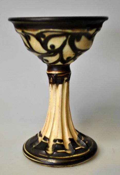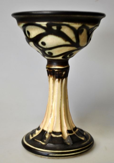 Herman A. Kähler: Kalk. Roter Ton mit braunen und hellen Glasuren. Hornmalerei. Mit geriffeltem Stiel. Signiert: HAK Danmark. Durchmesser: 11,8 cm. Höhe: 17,3 cm.Mit minimalen Haarrissen in der Glasur.