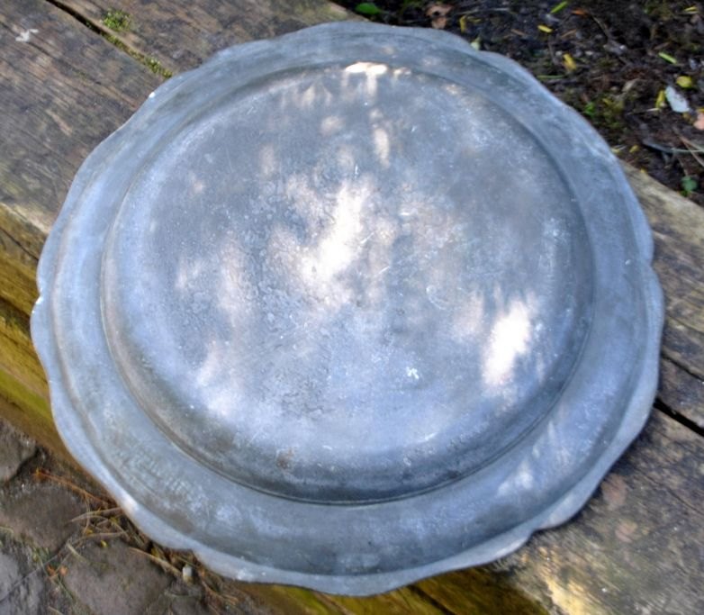 Große Zinnschale im Rokokol aus dem 18. Jahrhundert. Durchmesser: 37 cm. Keine sichtbaren Stempel.Bestellnummer: 29153