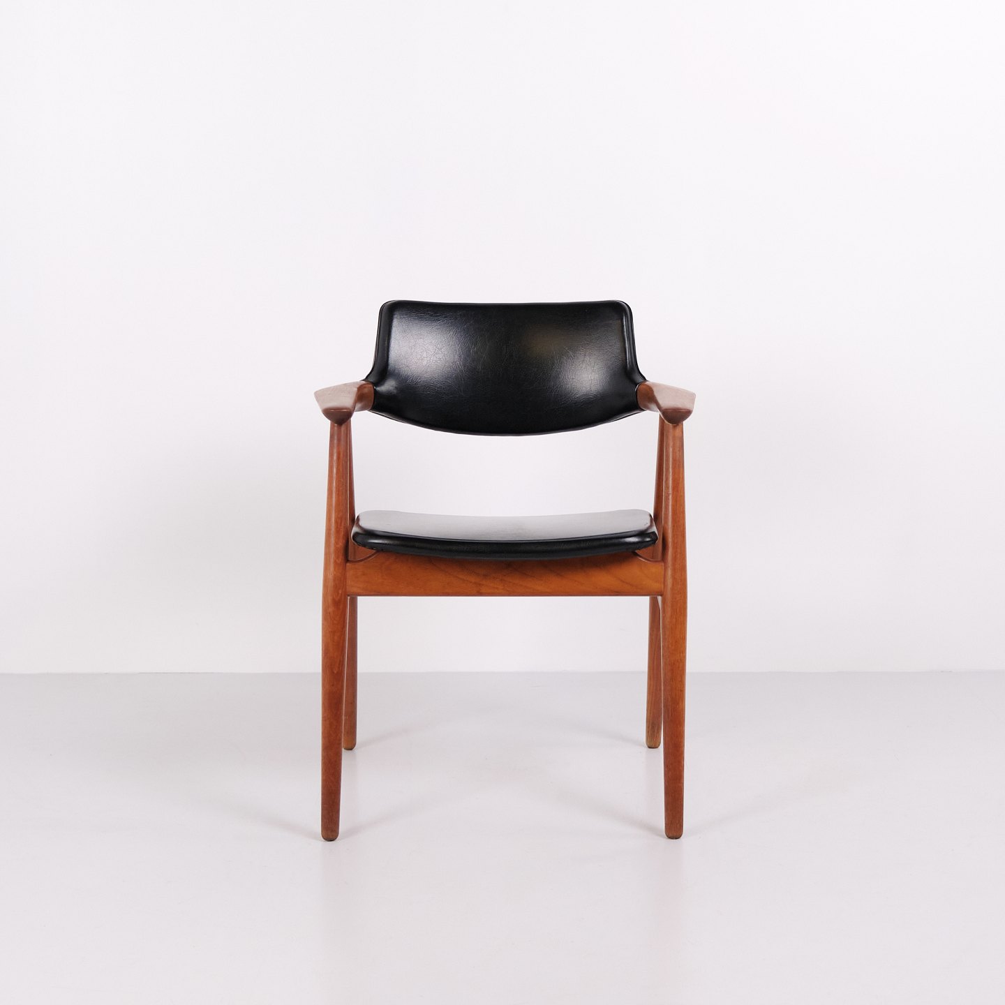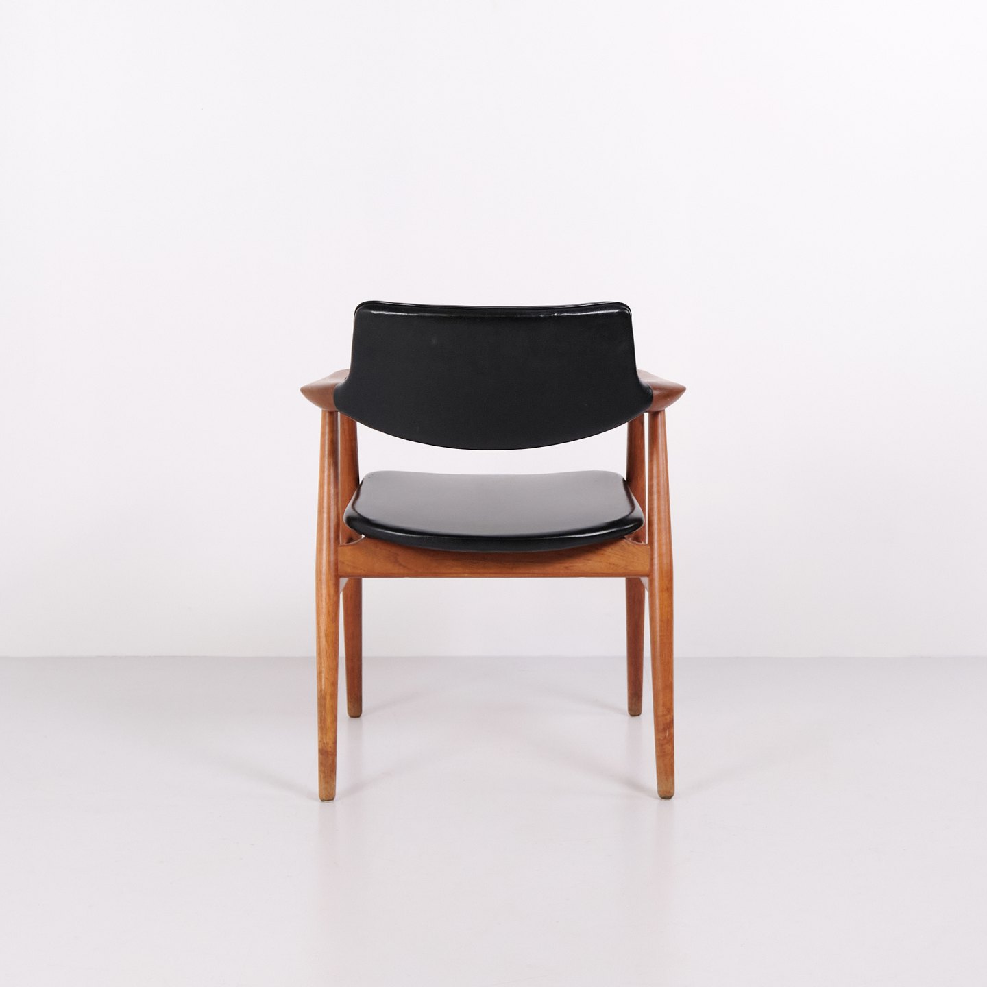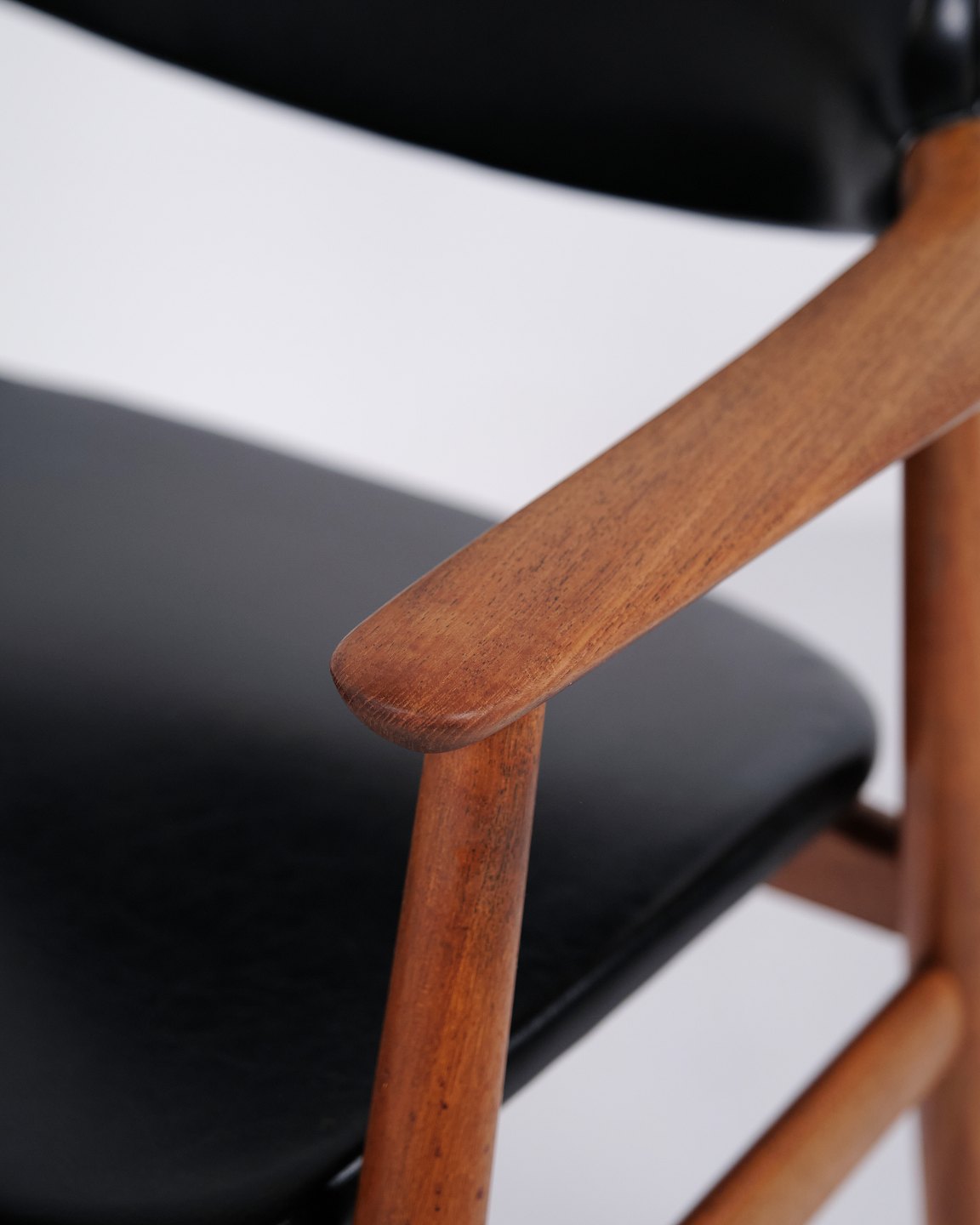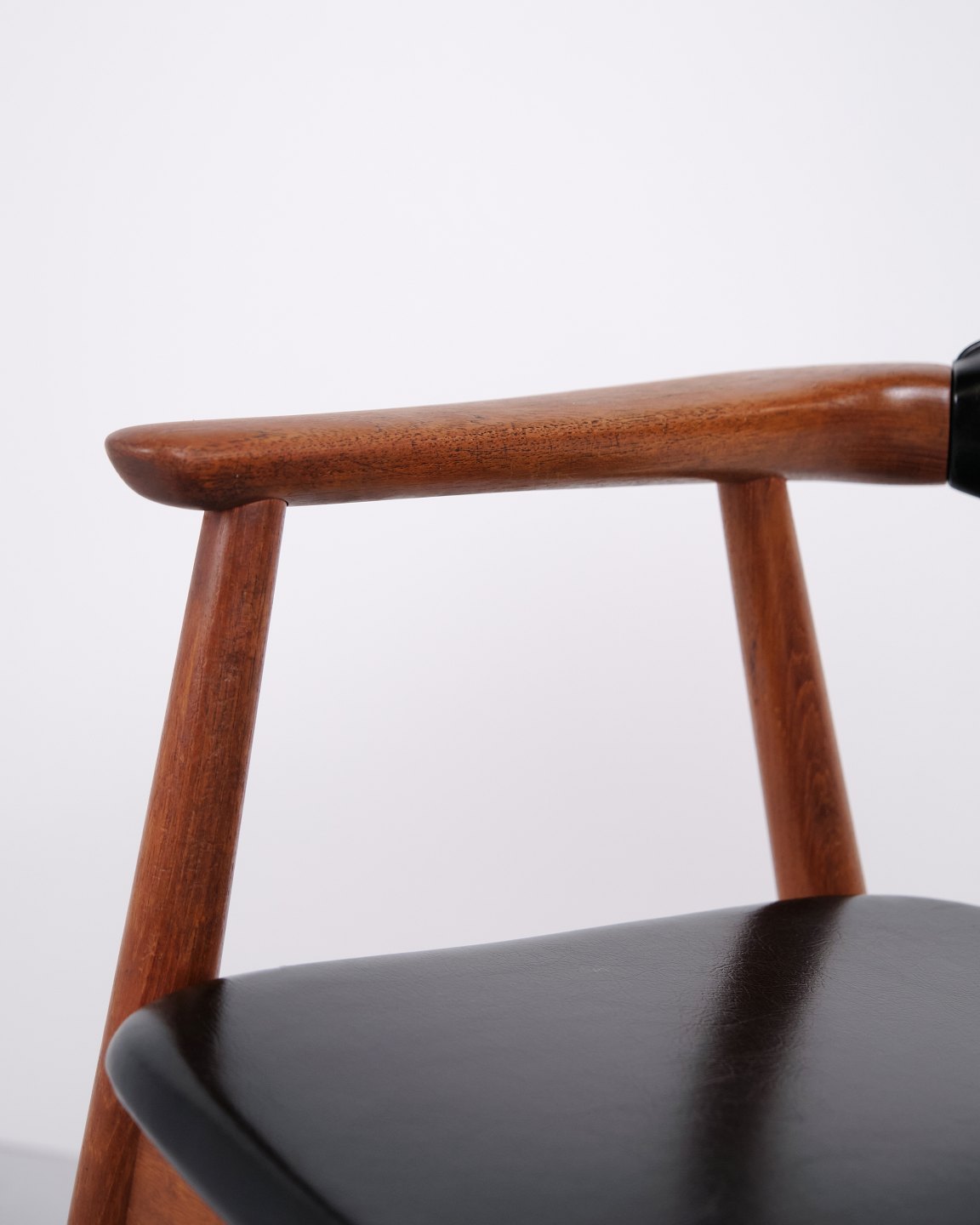 Satz von 6 GM11 Esszimmerstühlen, entworfen von Svend Aage Eriksen für Glostrup Møbelfabrik in den 1960er Jahren. Aus massivem Teak gefertigt mit Sitz- und Rückenflächen aus schwarzem Leder. Das Modell GM11 ist bekannt für organische Linien, leicht geschwungene Armlehnen und hohen Sitzkomfort. Ein klassisches Beispiel für dänisches Mid-Century Design mit hochwertiger Tischlerarbeit und eleganten Proportionen. Wird nur als komplettes Set verkauft.— Herkunft: Dänemark