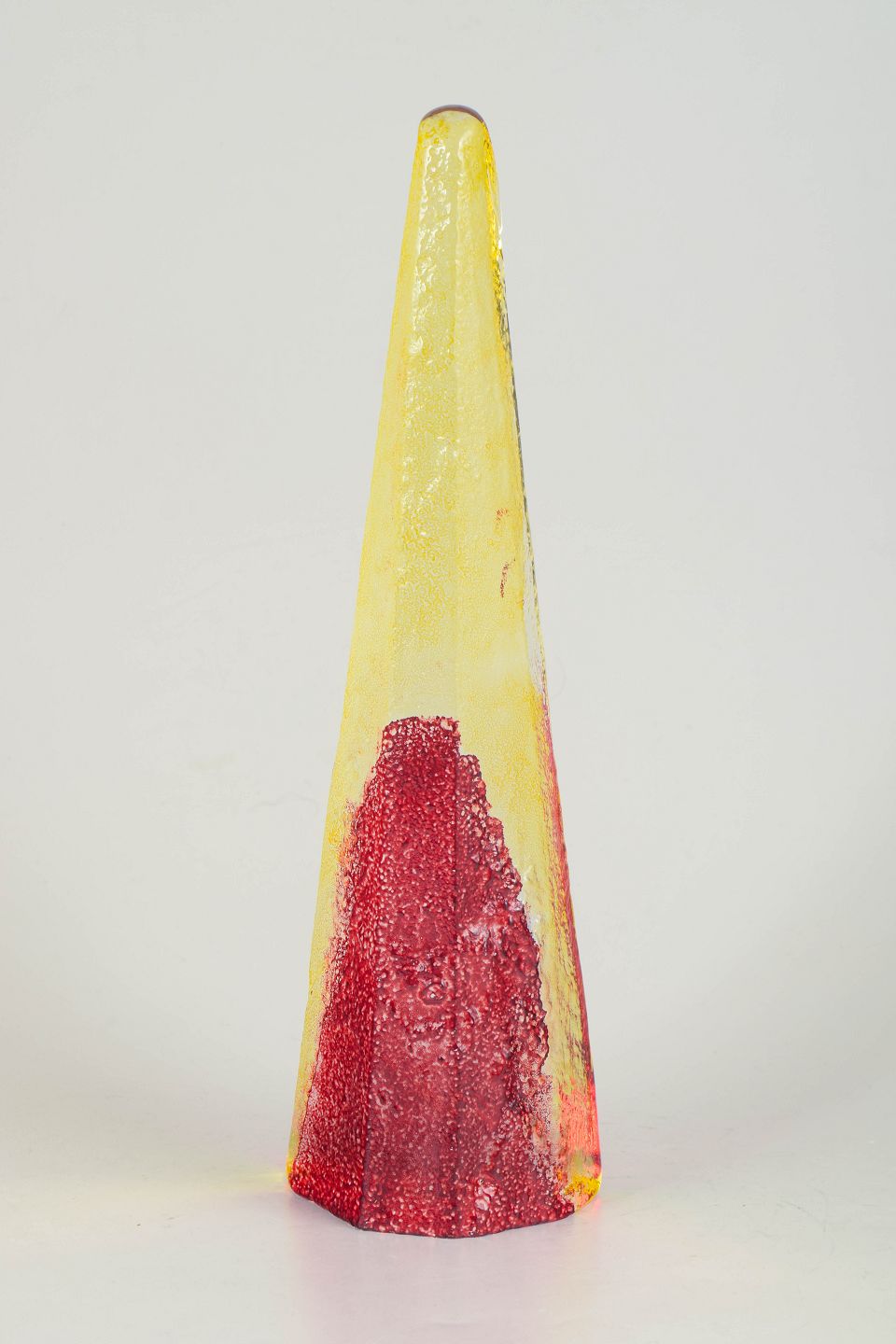Björn Hultqvist for Bergdala, unikt kunstglas objekt.Høj kegleformet skulpturel form i mundblæst glas med indkapslede farver i gul, rød og klare nuancer. Signeret Bergdala B. Hultqvist.
