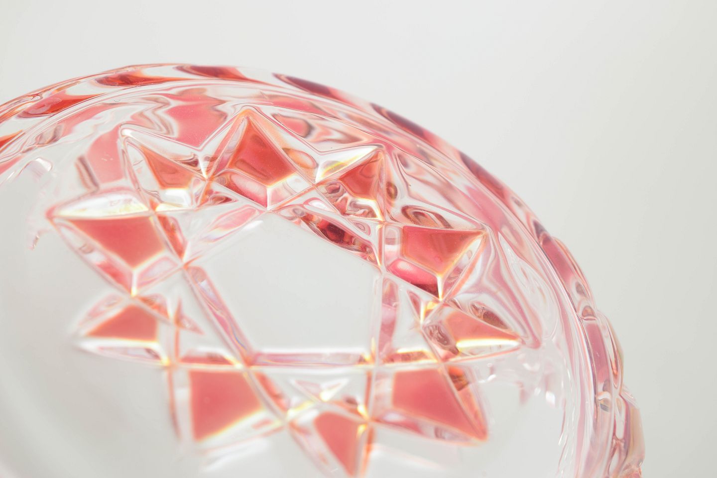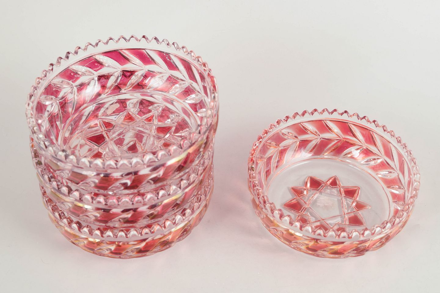 Bøhmisk krystalglas, sæt af fire dessertskåle.Pressede og slebne krystalskåle i klart og rosa tonet glas med geometrisk stjernedekor og facetslebne kanter.