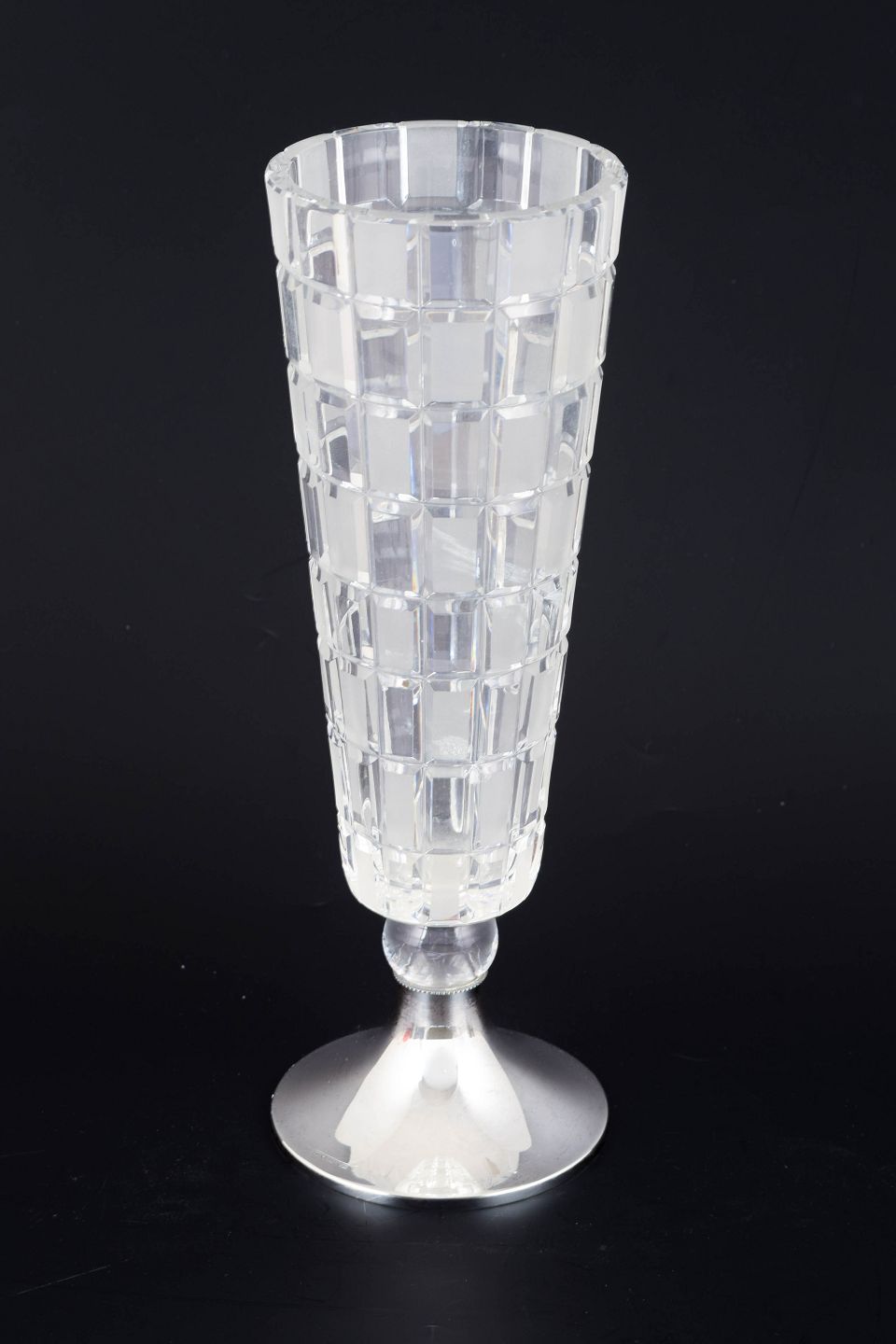 Aimo Okkolin for Riihimäen Lasi, “Ruuta” vase.Modernistisk vase i slebet krystal med geometrisk mønster og fod i 813 sølv. Designet fremstår med klar, arkitektonisk struktur typisk for finsk glasdesign fra perioden.