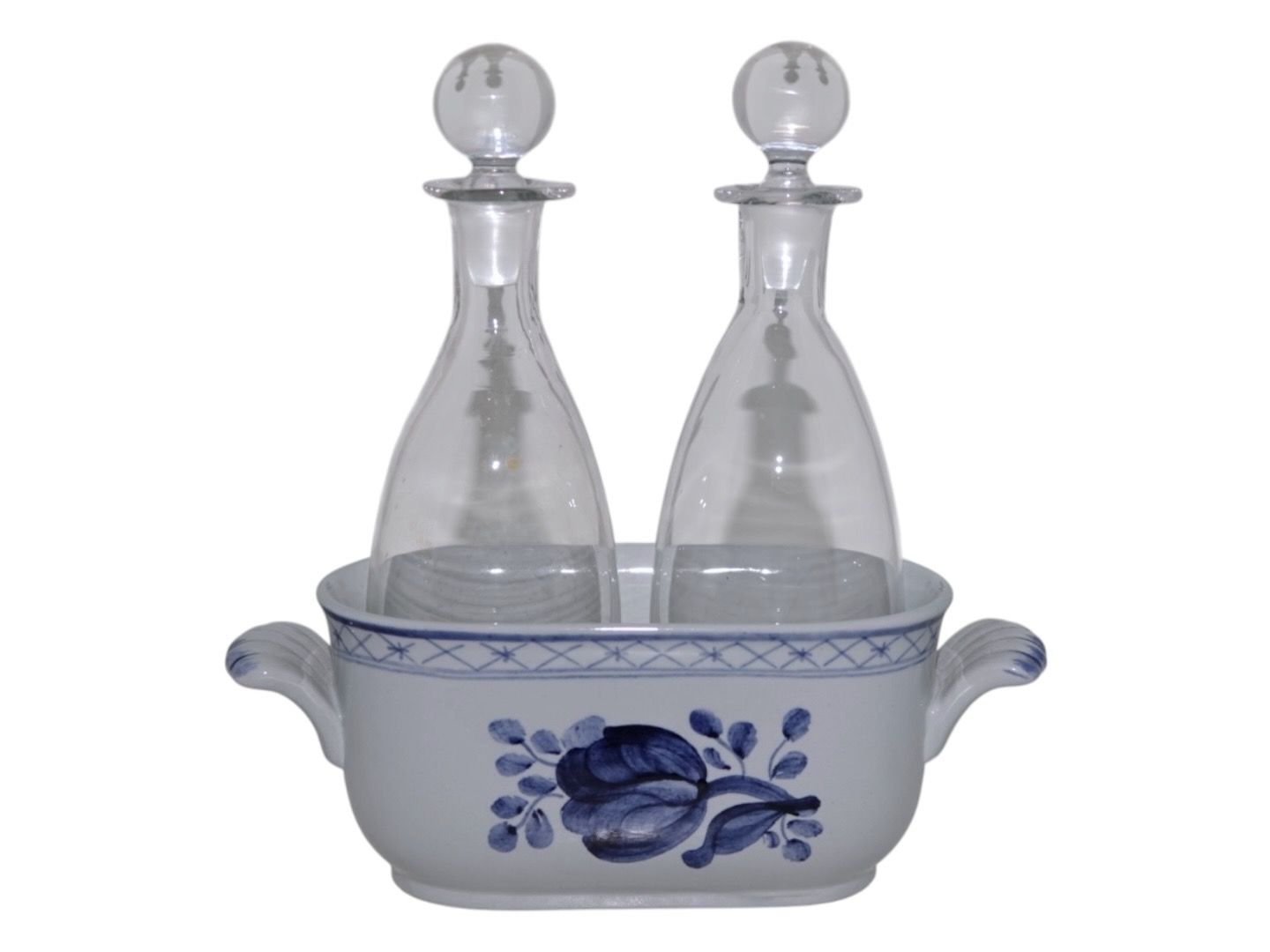 Aluminia Tranquebar, olie- og eddikeflaske i holder.Dekorationsnummer 11/1804.