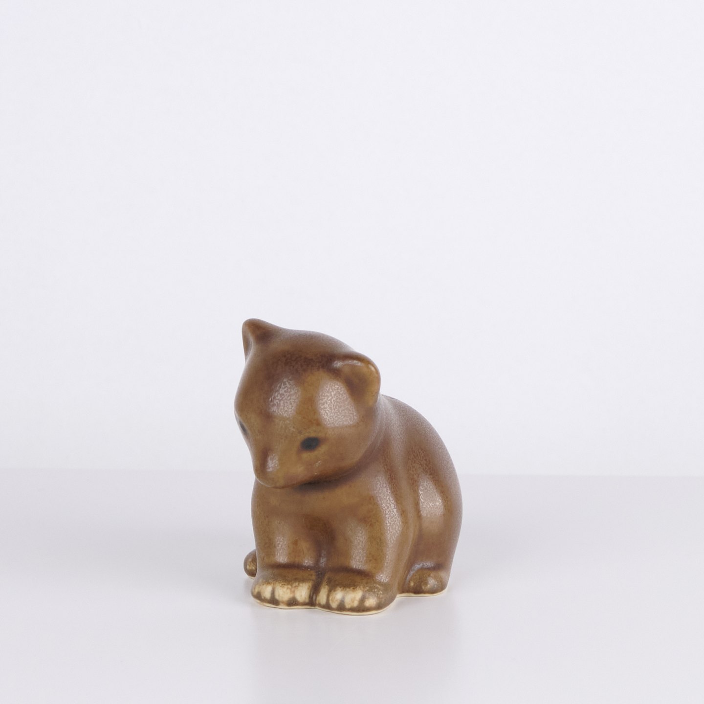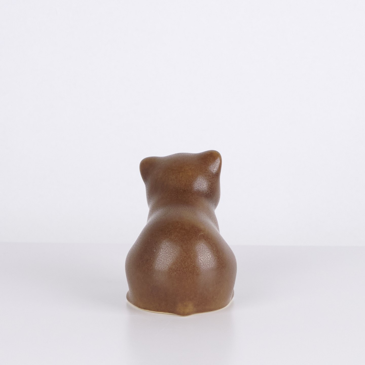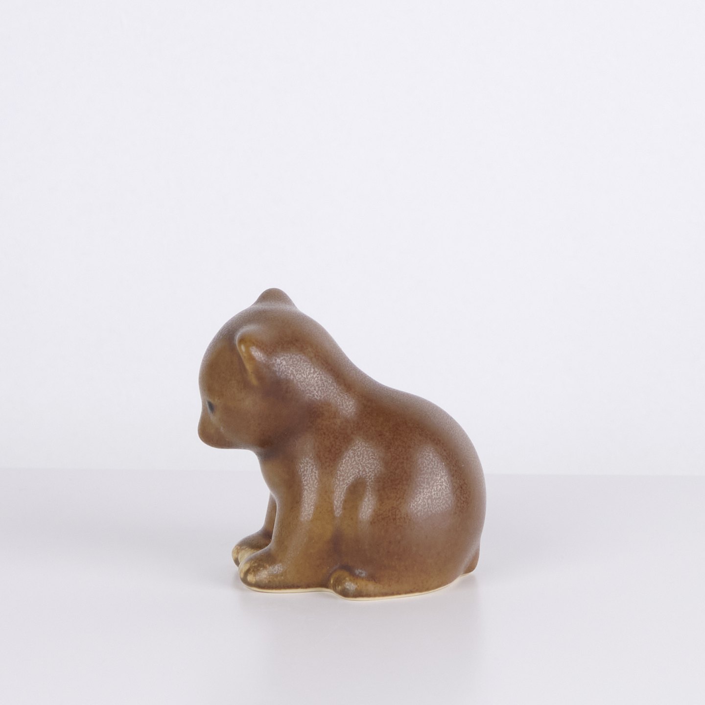 Katzenfigur von Knud Basse aus glasierter Keramik. Die Figur hat weiche organische Formen und einen ruhigen stilisierten Ausdruck, typisch für Knud Basses beliebte Tierfiguren. Dänische Kunstkeramik und begehrtes Sammlerstück aus der Mid-Century-Periode.