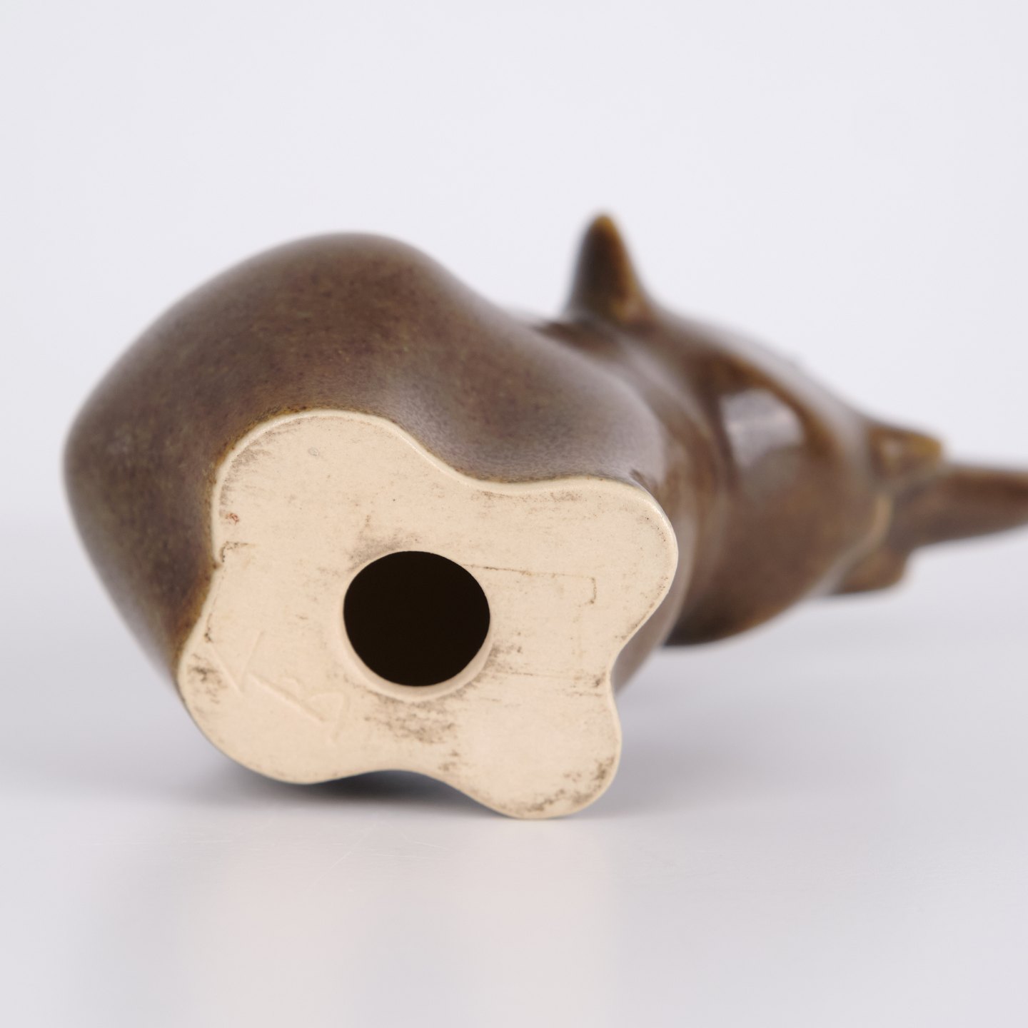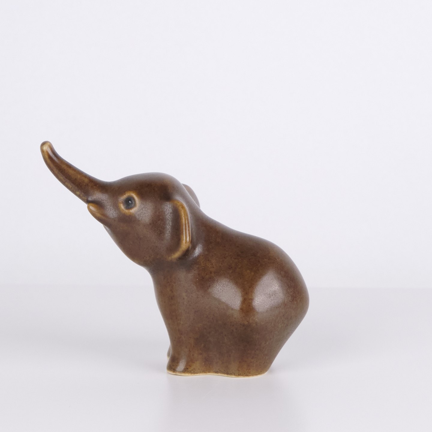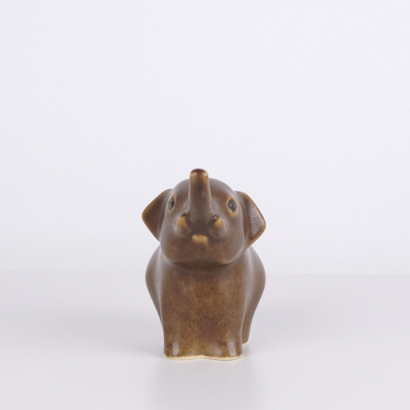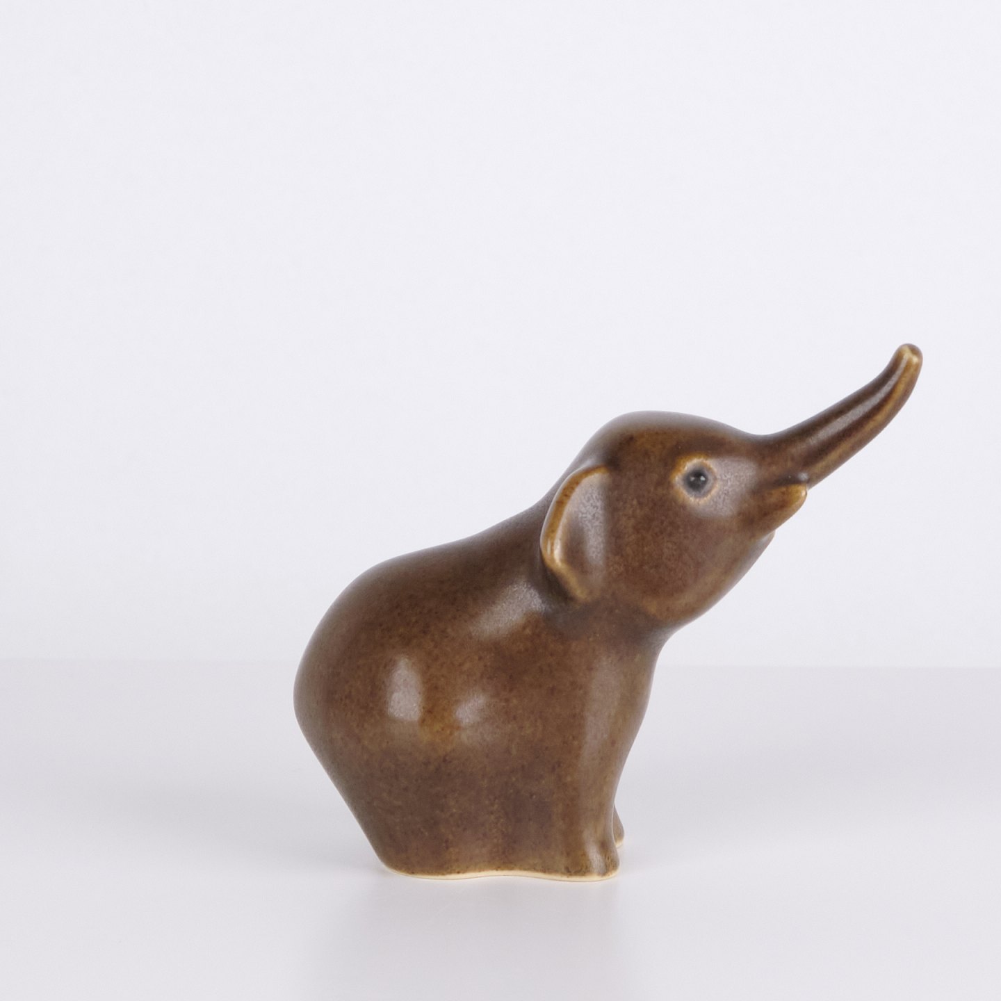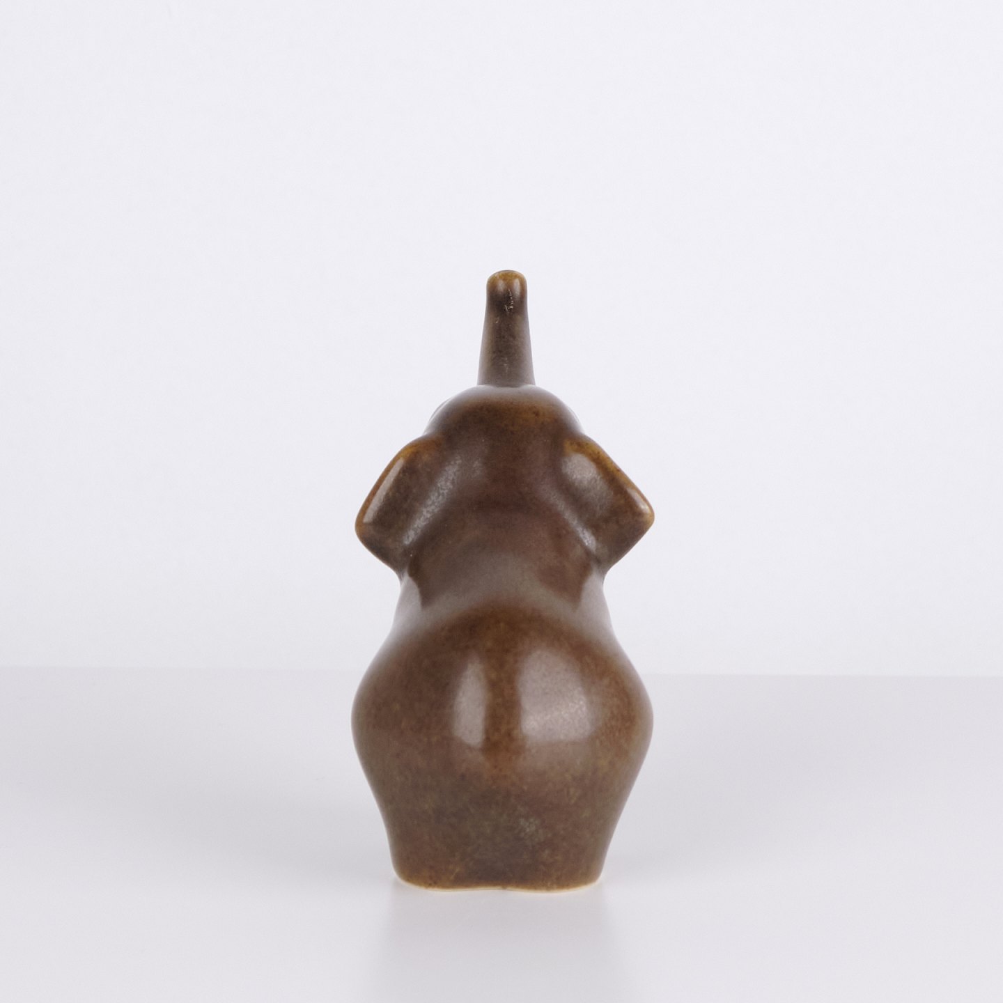 Elefantenfigur von Knud Basse aus braun glasierter Keramik. Die Figur ist mit erhobenem Rüssel und abgerundeten Formen modelliert, was ihr einen lebendigen und dekorativen Ausdruck verleiht. Ein klassisches Beispiel dänischer Tierkeramik, bei der einfache Linien und charaktervolle Motive im Mittelpunkt stehen. Begehrte Figur unter Sammlern von Knud Basse und dänischer Keramik.— Herkunft: Dänemark