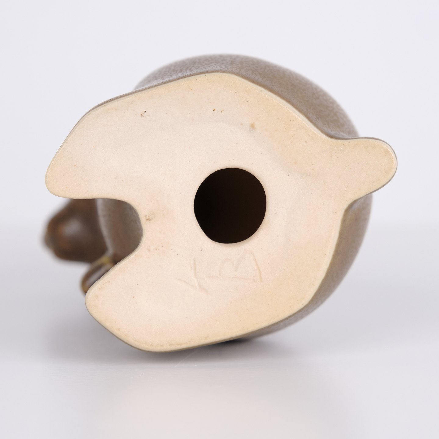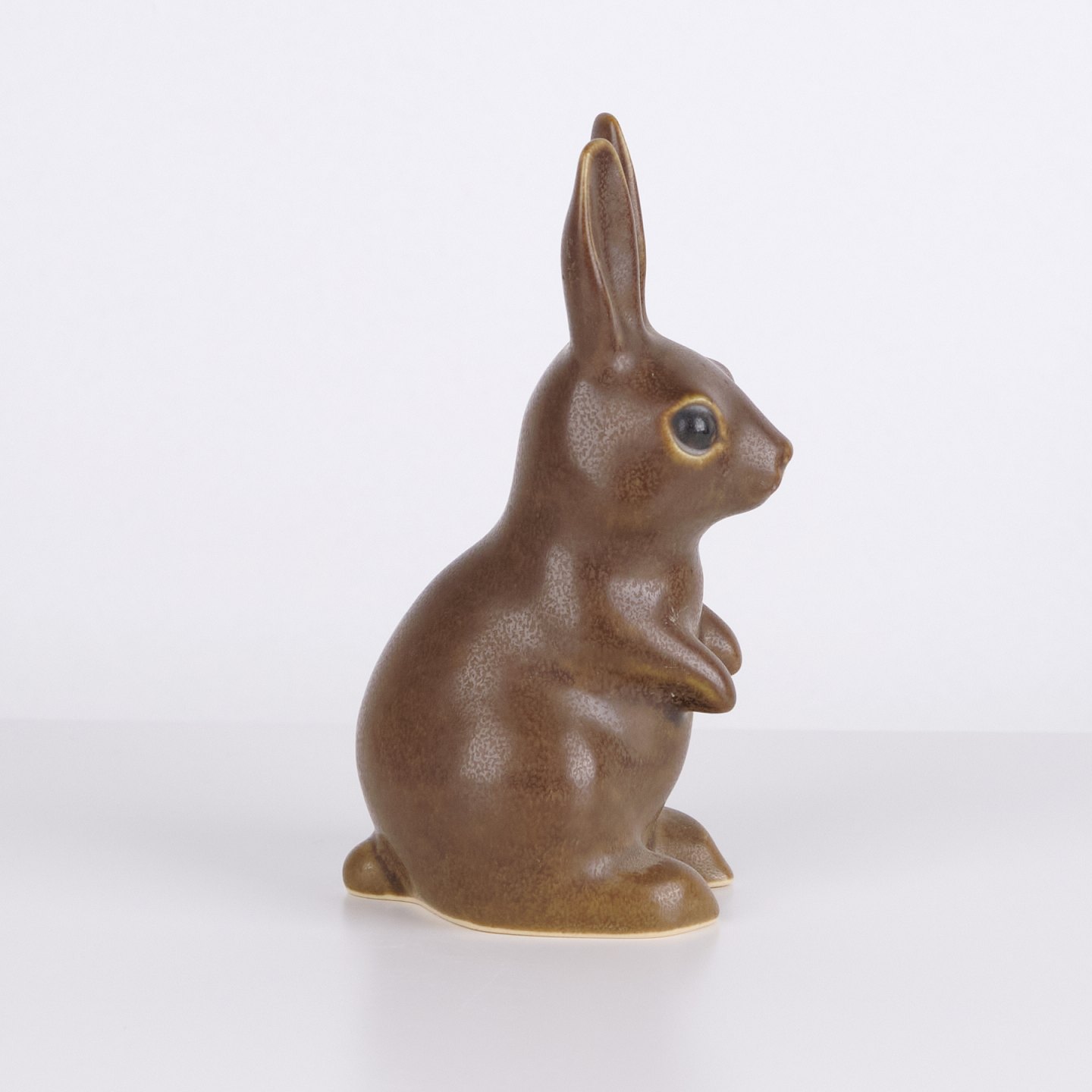 Große Hasenfigur von Knud Basse aus braun glasierter Keramik. Die Figur ist in aufrecht sitzender Form mit langen Ohren und fein handgemalten Augen modelliert.— Herkunft: Dänemark