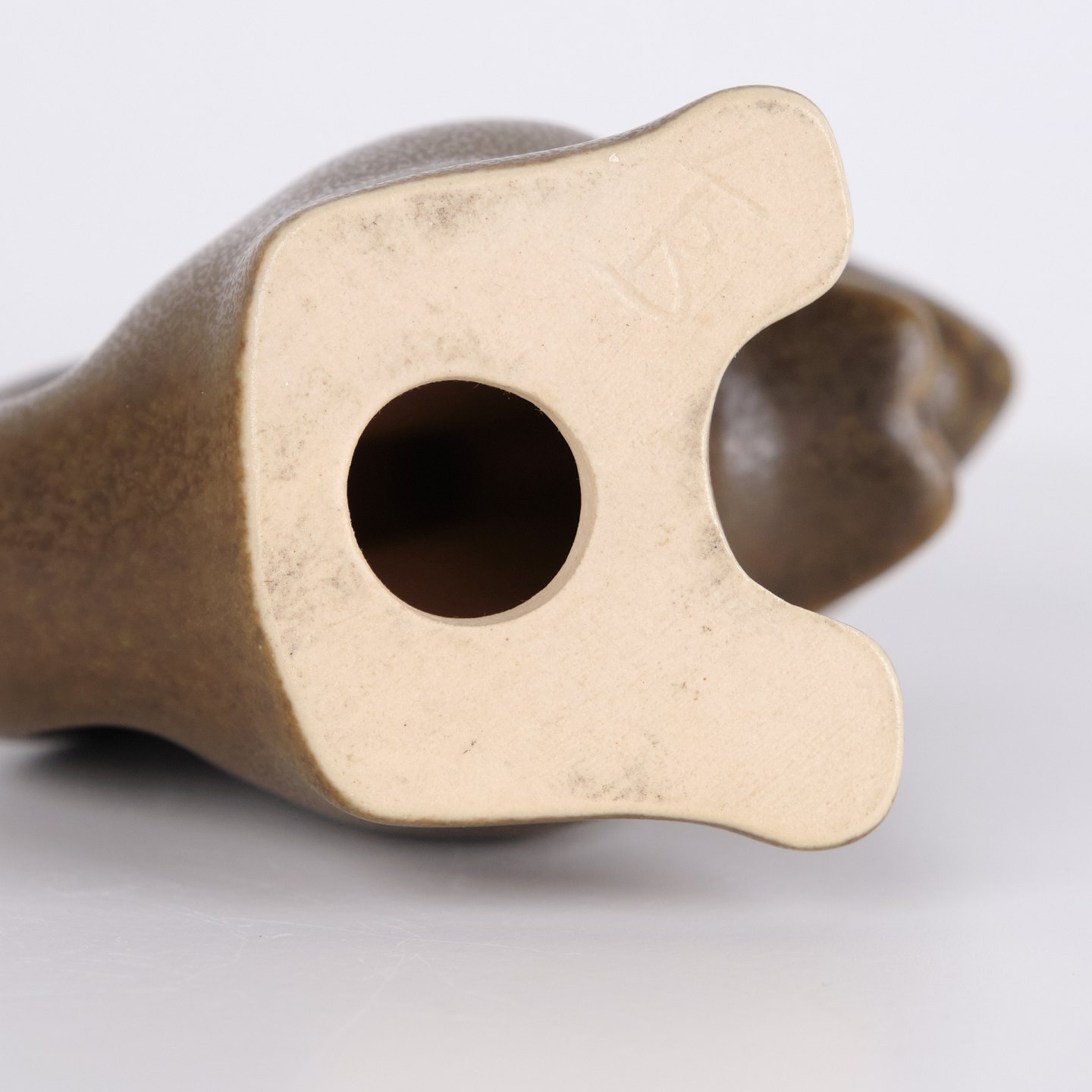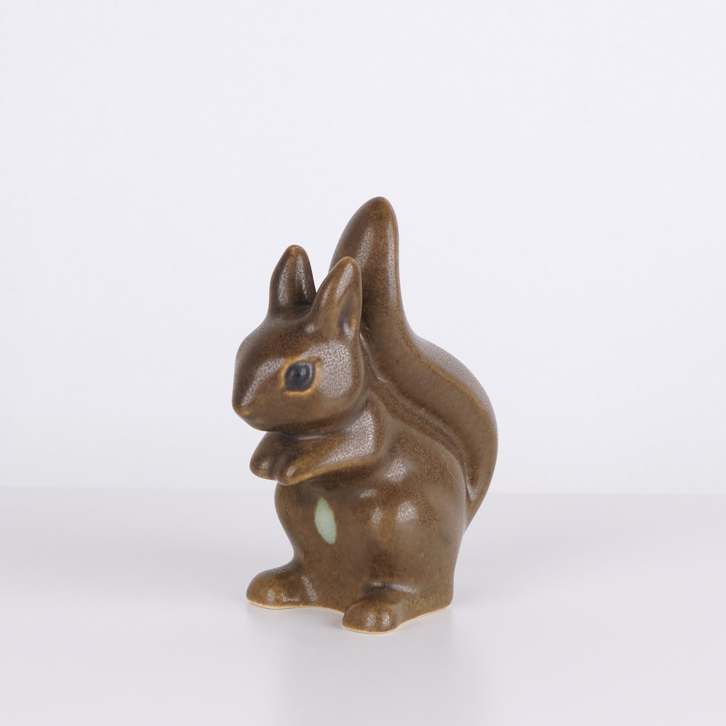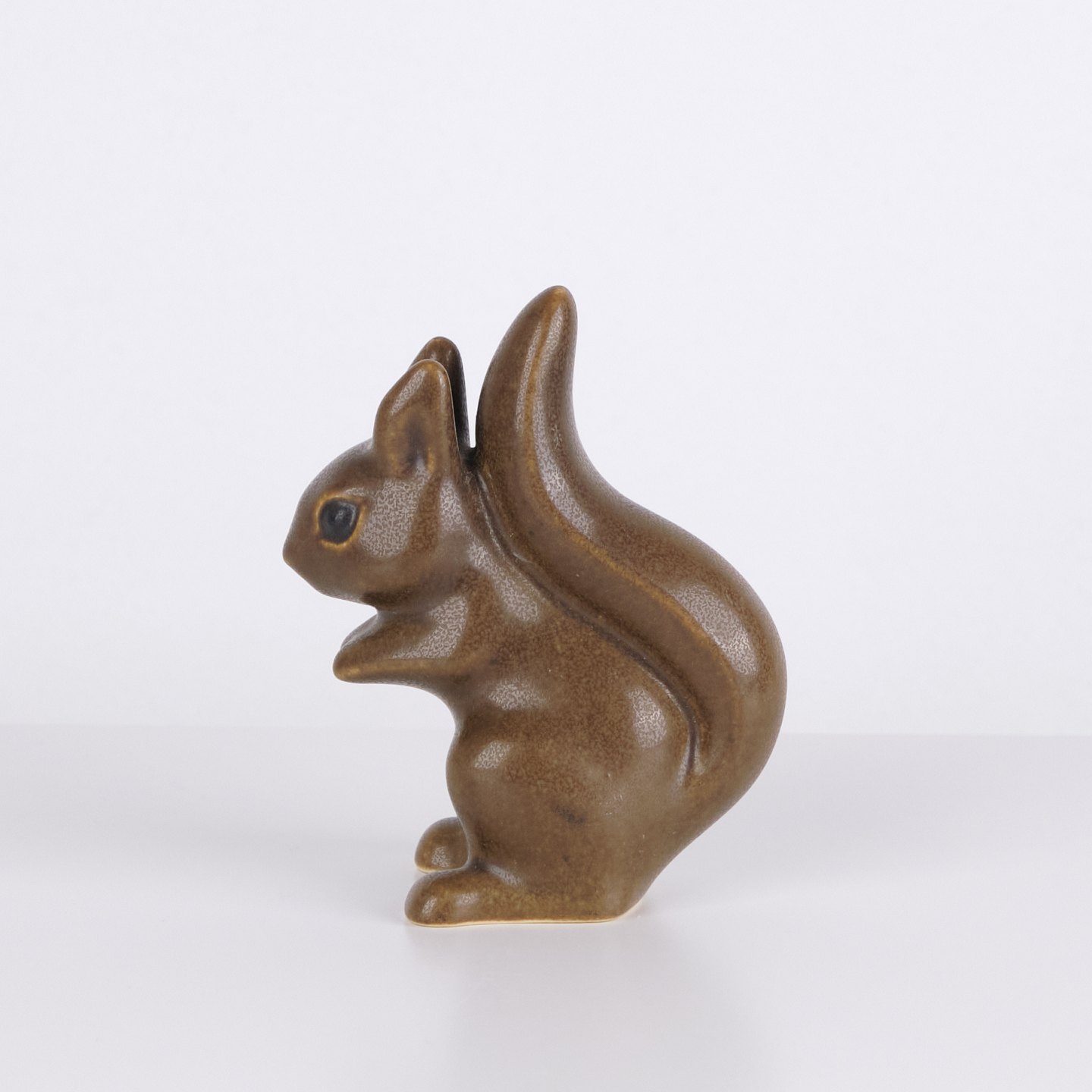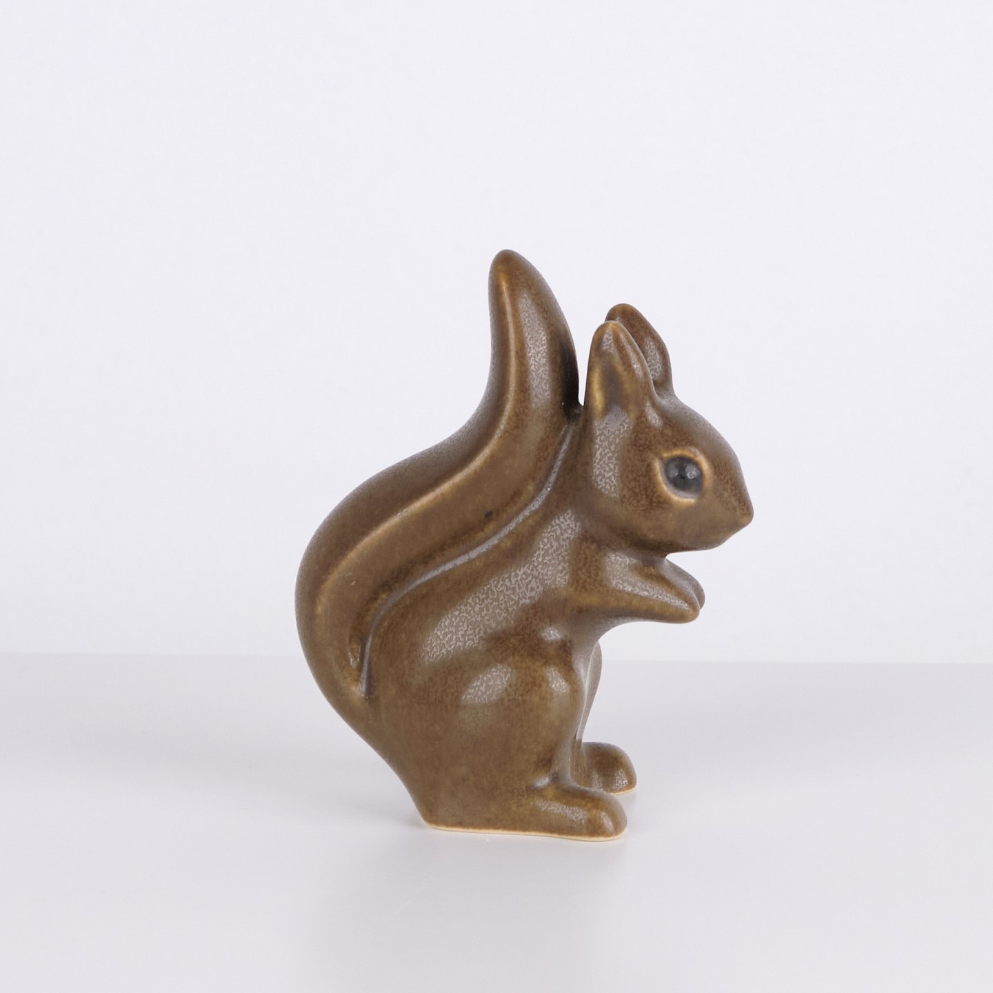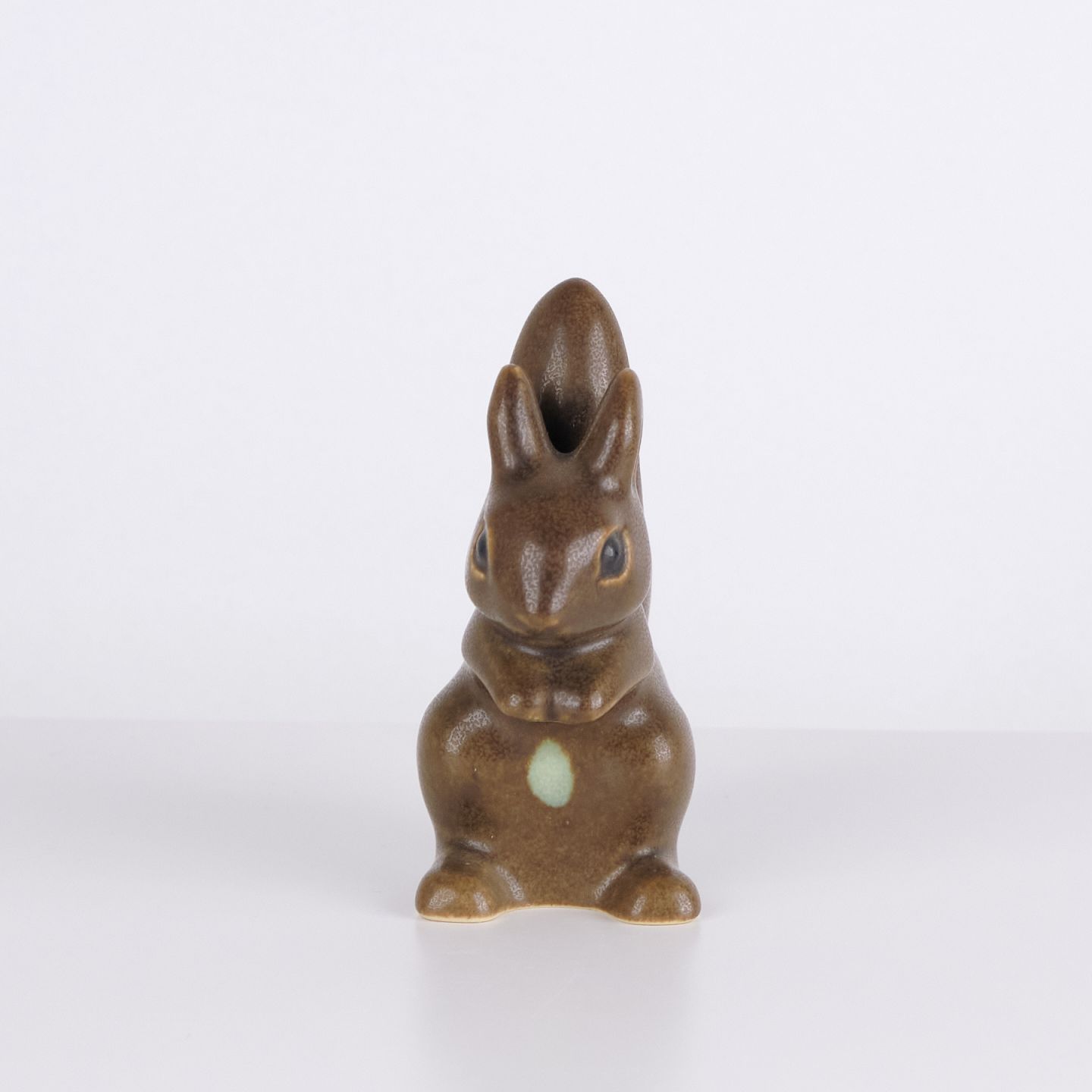 Hasenfigur von Knud Basse aus braun glasierter Keramik. Das Modell zeigt einen aufrecht sitzenden Hasen mit zusammengelegten Vorderpfoten und markanter Schwanzform auf der Rückseite. Die Figur ist vorne mit einem hellen Detail dekoriert und ein klassisches Beispiel für Knud Basses beliebte Tierfiguren aus den 1960er Jahren.— Herkunft: Dänemark